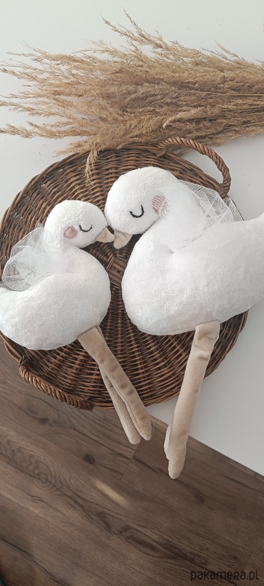 Przepiękna maskotka, przytulanka. Ozdoba pokoju. Idealny na prezent dla małej dziewczynki na narodziny, Chrzest, urodziny, święta. Wykonany z mięciutkiej tkaniny minky, antyalergiczne wypełnienie. Na łabędziu lub jego skrzydełkach możemy wyhaftować imię dziecka, datę urodzenia. Przy zamówieniu ustalamy dodatki (np kokardka na szyi, na głowie, wianek) skrzydełka (materiałowe z imieniem lub tiulowe) a także czcionkę i jej kolor. Łabędź może mieć nóżki lub nie. Dostępny również w większym rozmiarze. Maskotkę umieszczamy w kartoniku na którym możemy dodać dowolną dedykację. Zachęcamy do zakupu.