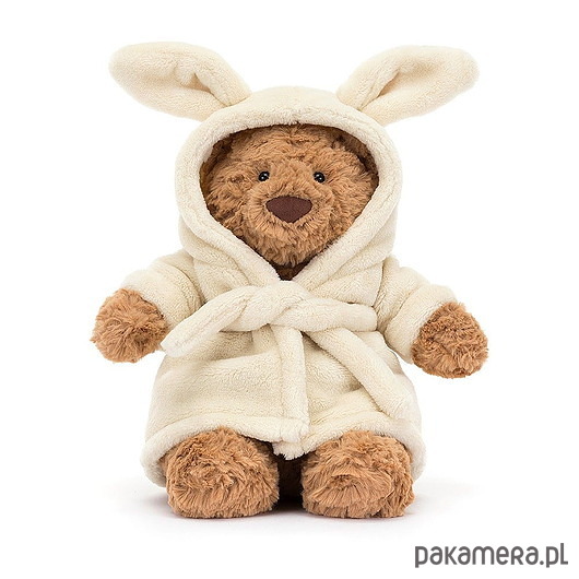 Urocza, miła i bardzo miękka przytulanka w kształcie misia w szlafroku z miłym futerkiem.