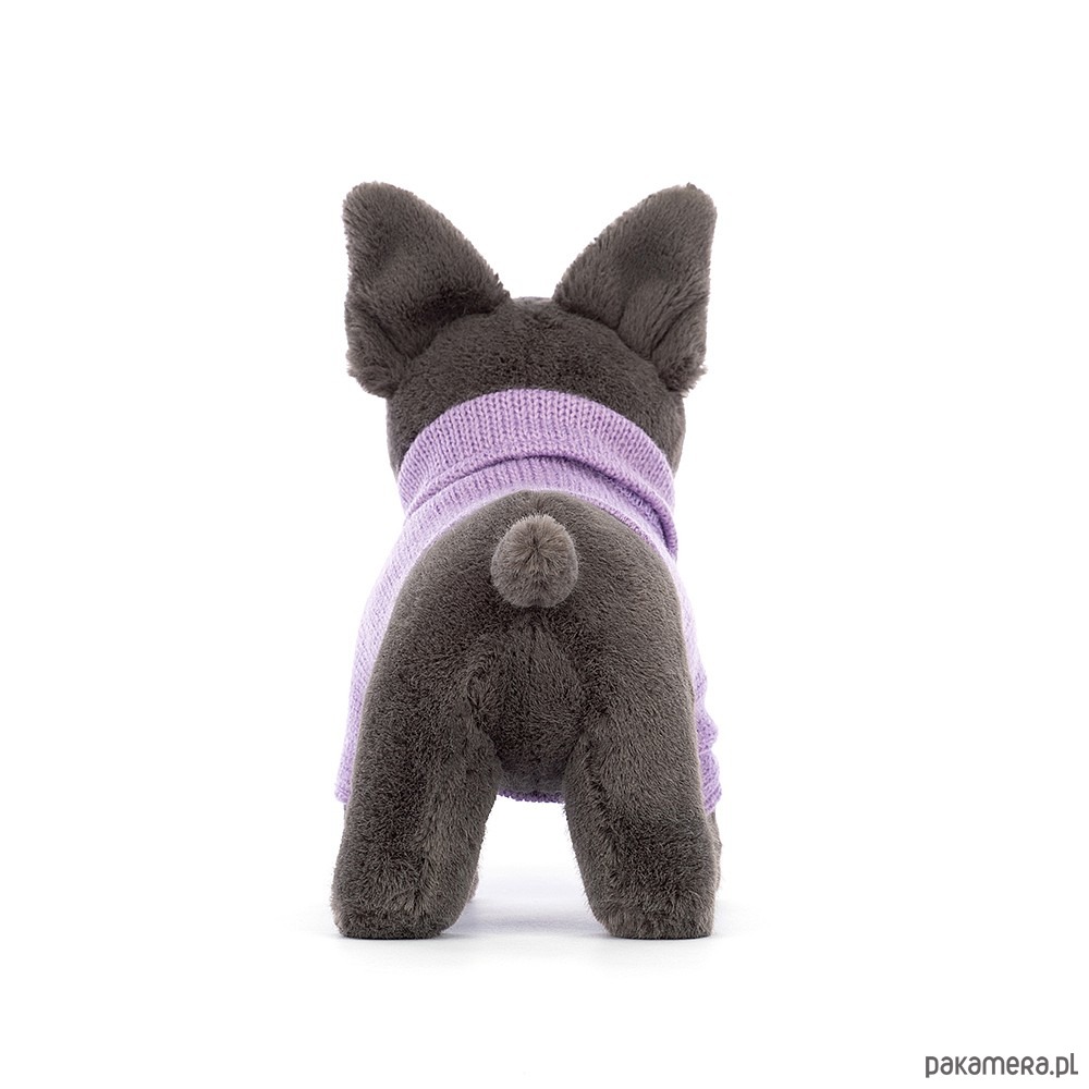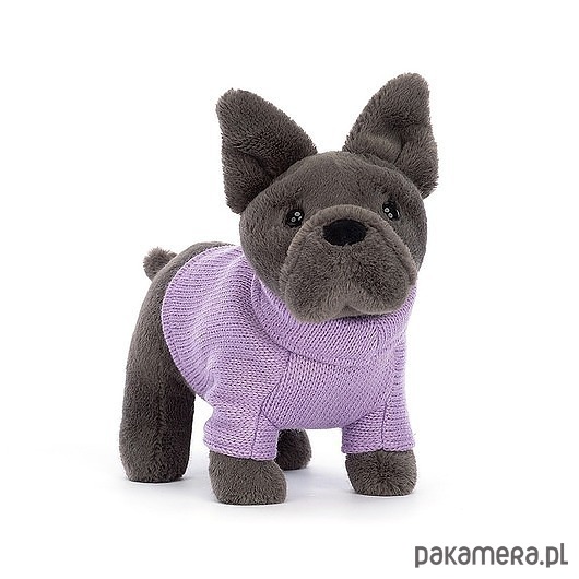 Urocza, miła i bardzo miękka przytulanka w kształcie pieska rasy Buldog Francuski z bardzo miłym futerkiem.