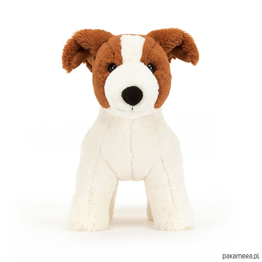 Urocza, miła i bardzo miękka przytulanka w kształcie pieska Jack Russell Terriera z miłym futerkiem.