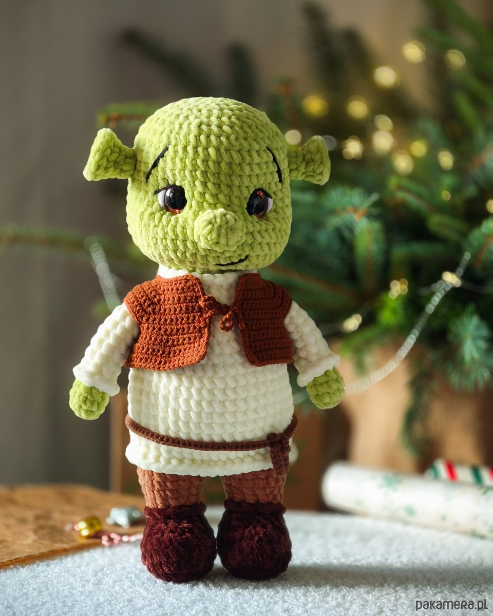 Pluszowy Shrek na szydełku będzie uroczym prezentem dla dziecka lub przyjaciół na święta, będzie cudowną ozdobą w pobliżu choinki lud dekoracją do pokoju dziecięcego!