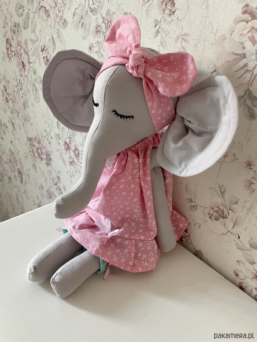 Mam na imię Lena i jestem wyjątkową słonicą. Jak przystało na słonia posiadam duże uszy oraz jeszcze większą trąbę. Moje oczka zostały ręcznie wyhaftowane. Lubię mieć swój własny styl. Noszę tunikę oraz spodenki, a moją główkę zdobi urocza opaska.