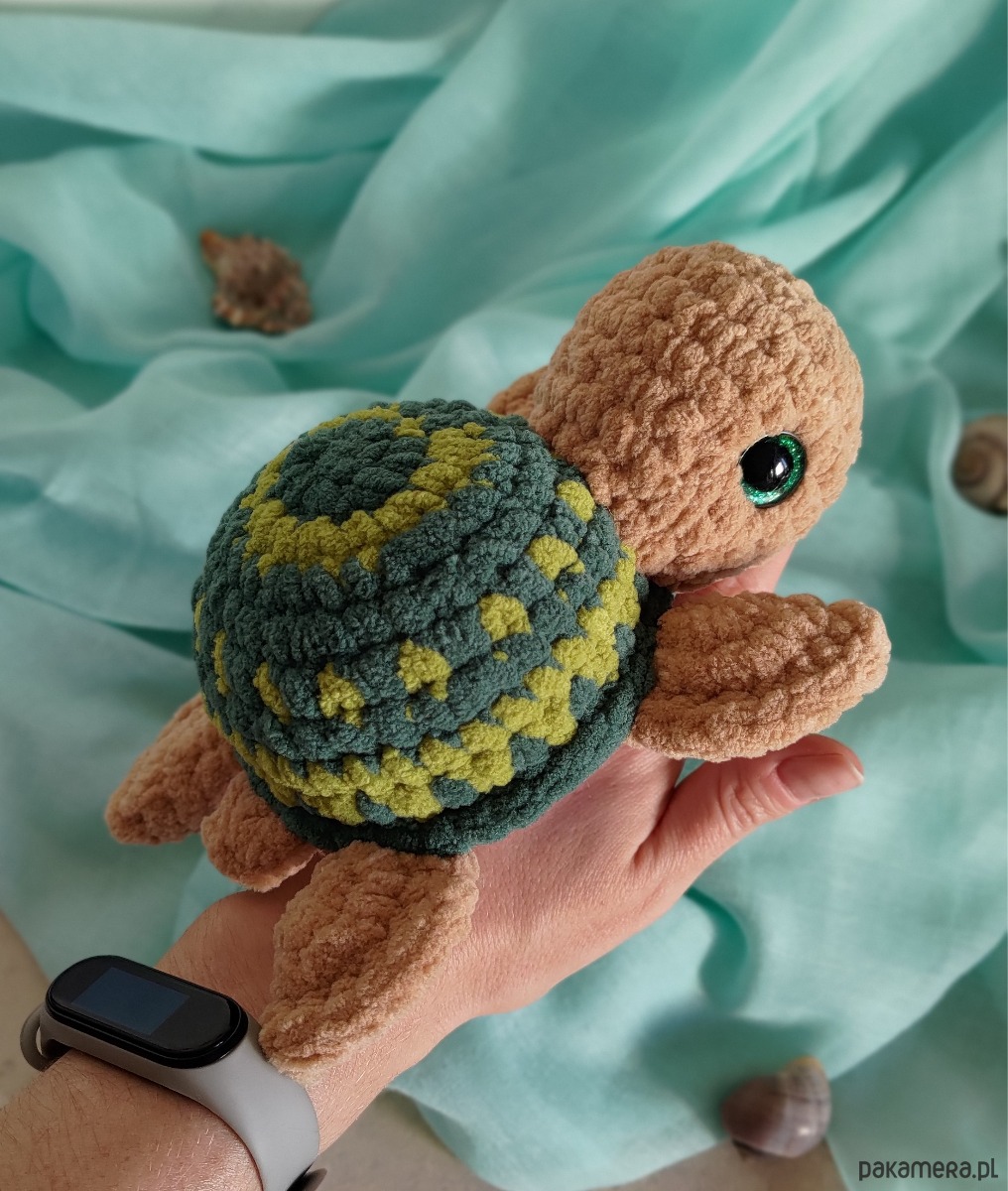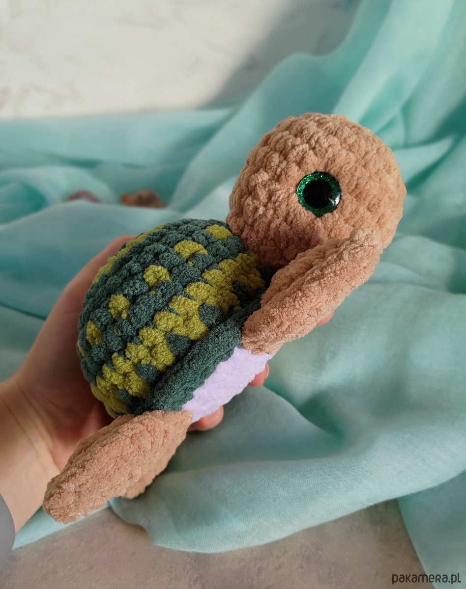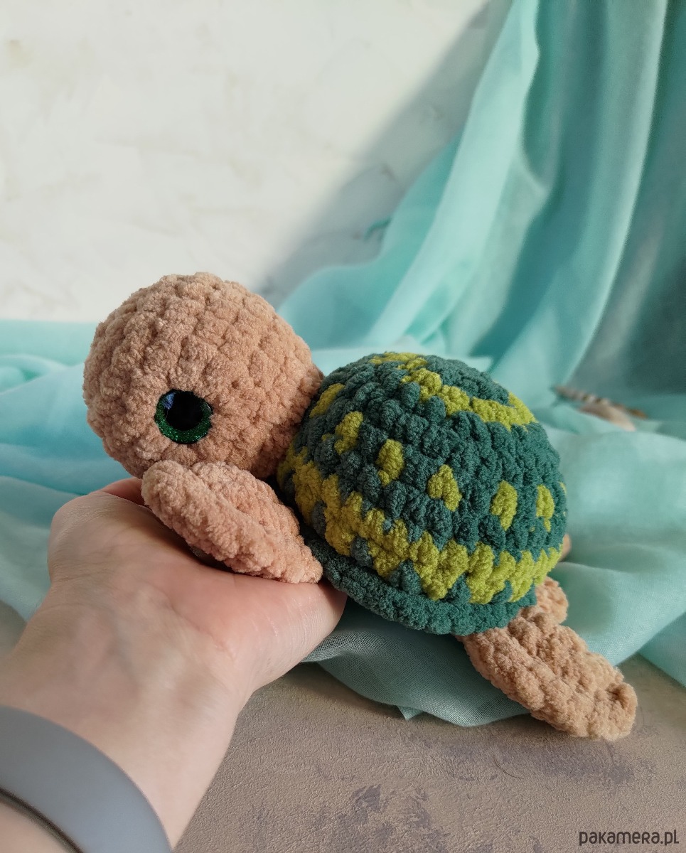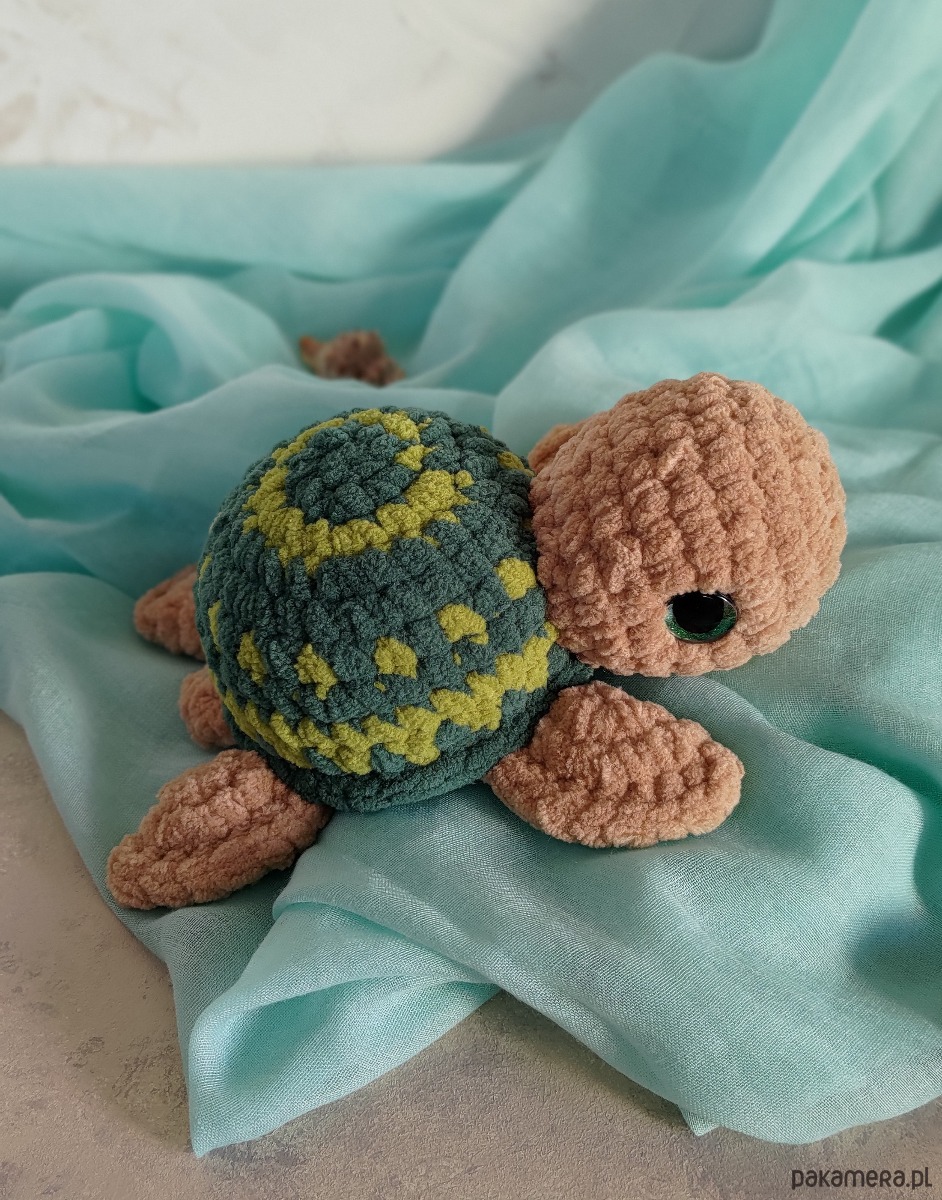 - Żółwik wykonany jest z pluszowej miękkiej włóczki i jest bardzo miękki w dotyku.