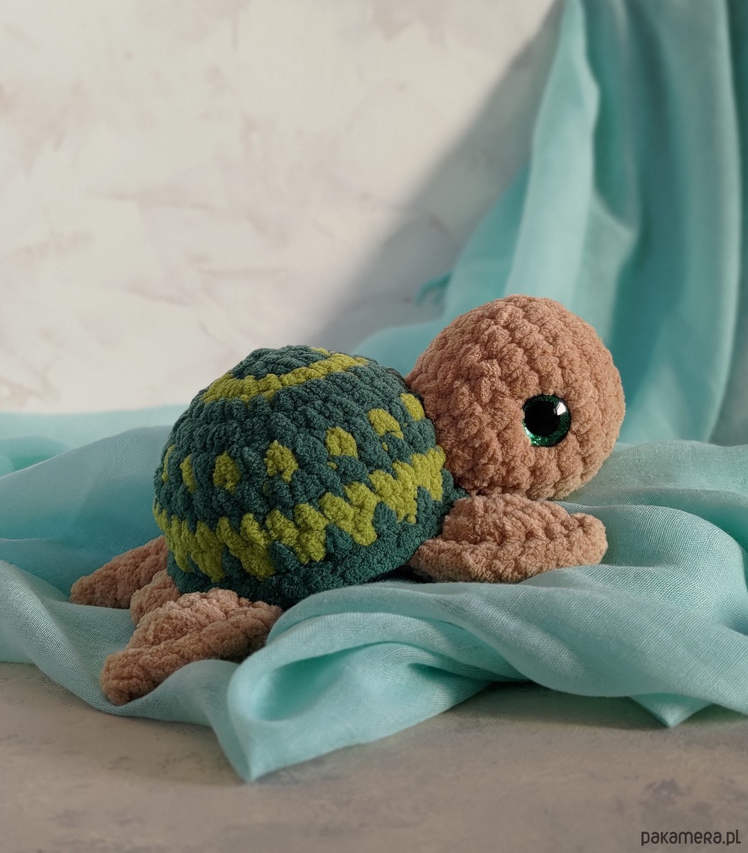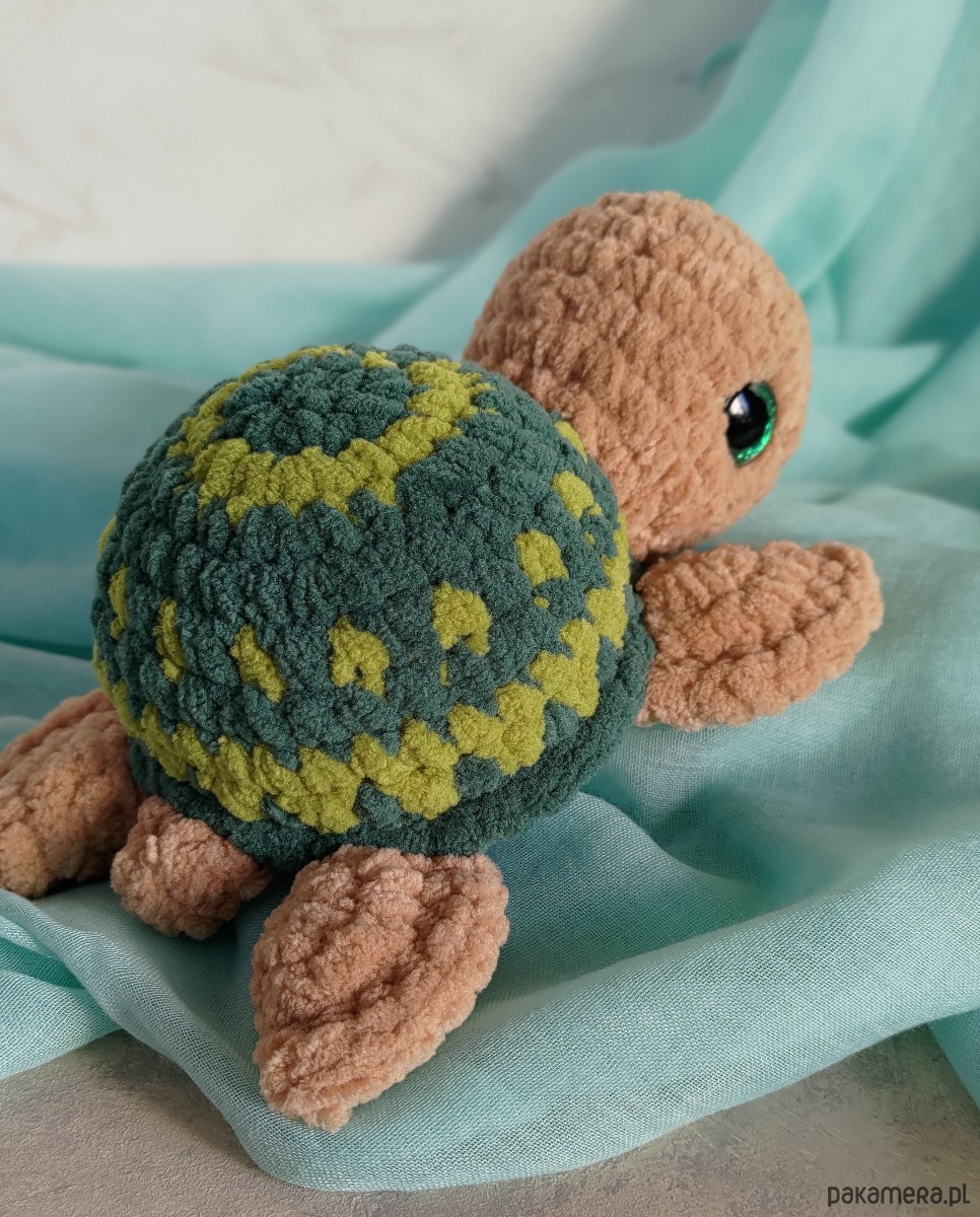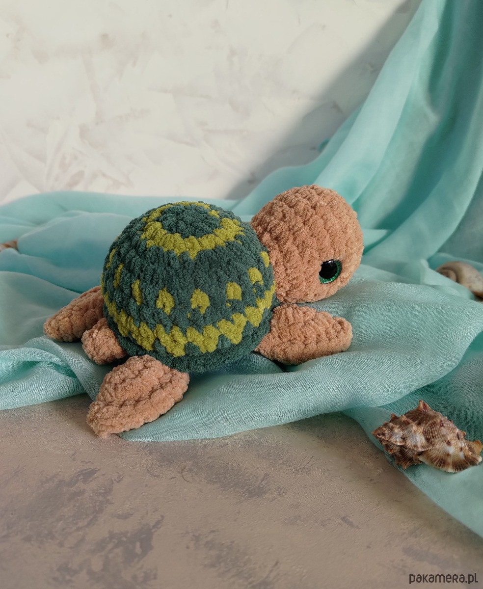 - Żółwik wykonany jest z pluszowej miękkiej włóczki i jest bardzo miękki w dotyku.