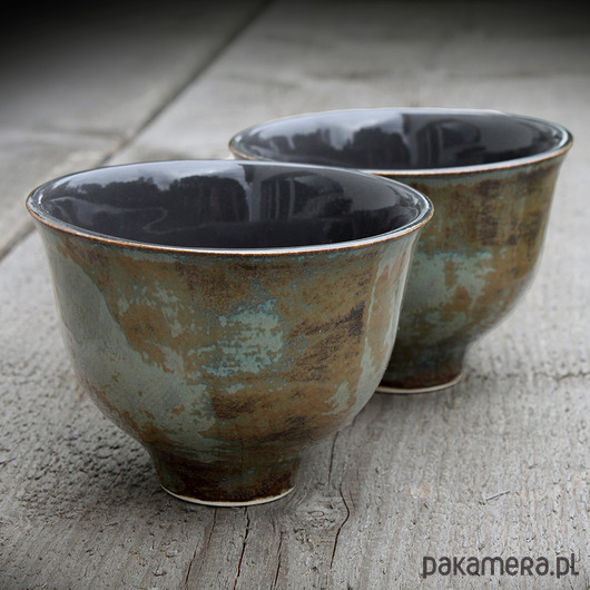 Oryginalne i efektowne czarki do herbaty ręcznie wykonane ze spieczonej kamionki,wewnątrz szkliwione ciemnoszarym błyszczącym szkliwem, na zewnątrz efektownym brunatno zielonym. Wymiary: ok. 9,5cm średnicy i 8cm wysokości