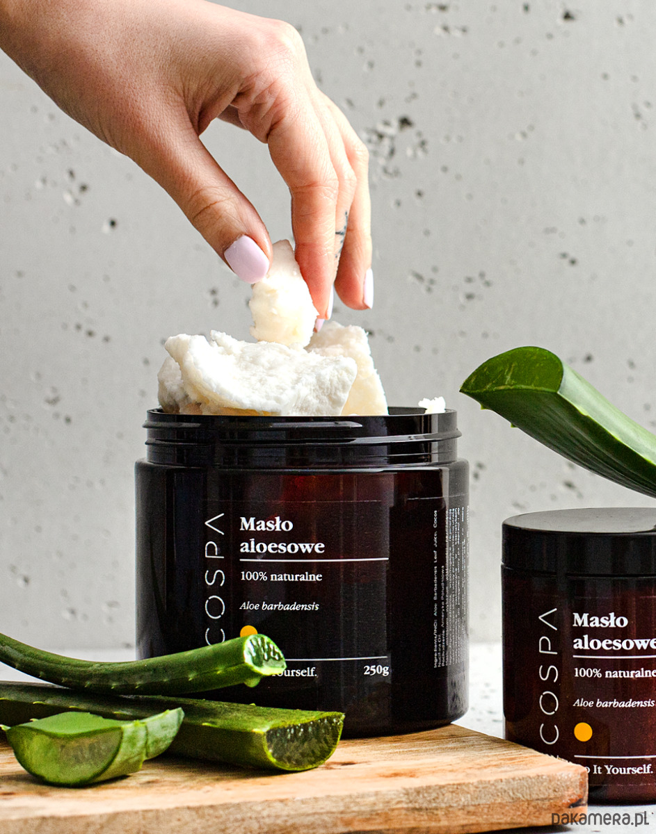 100% naturalne masło aloesowe o białym kolorze, neutralnym zapachu i przyjemnej konsystencji, składa się z naturalnego soku z aloesu i oleju kokosowego. Nawilża, łagodzi podrażnienia, wspomaga regenerację naskórka, chroniące skórę i włosy przed nadmierną utratą wody. Przeznaczone do pielęgnacji skóry suchej, wrażliwej, z problemami (egzemą i ASZ) oraz po depilacji i po opalaniu.