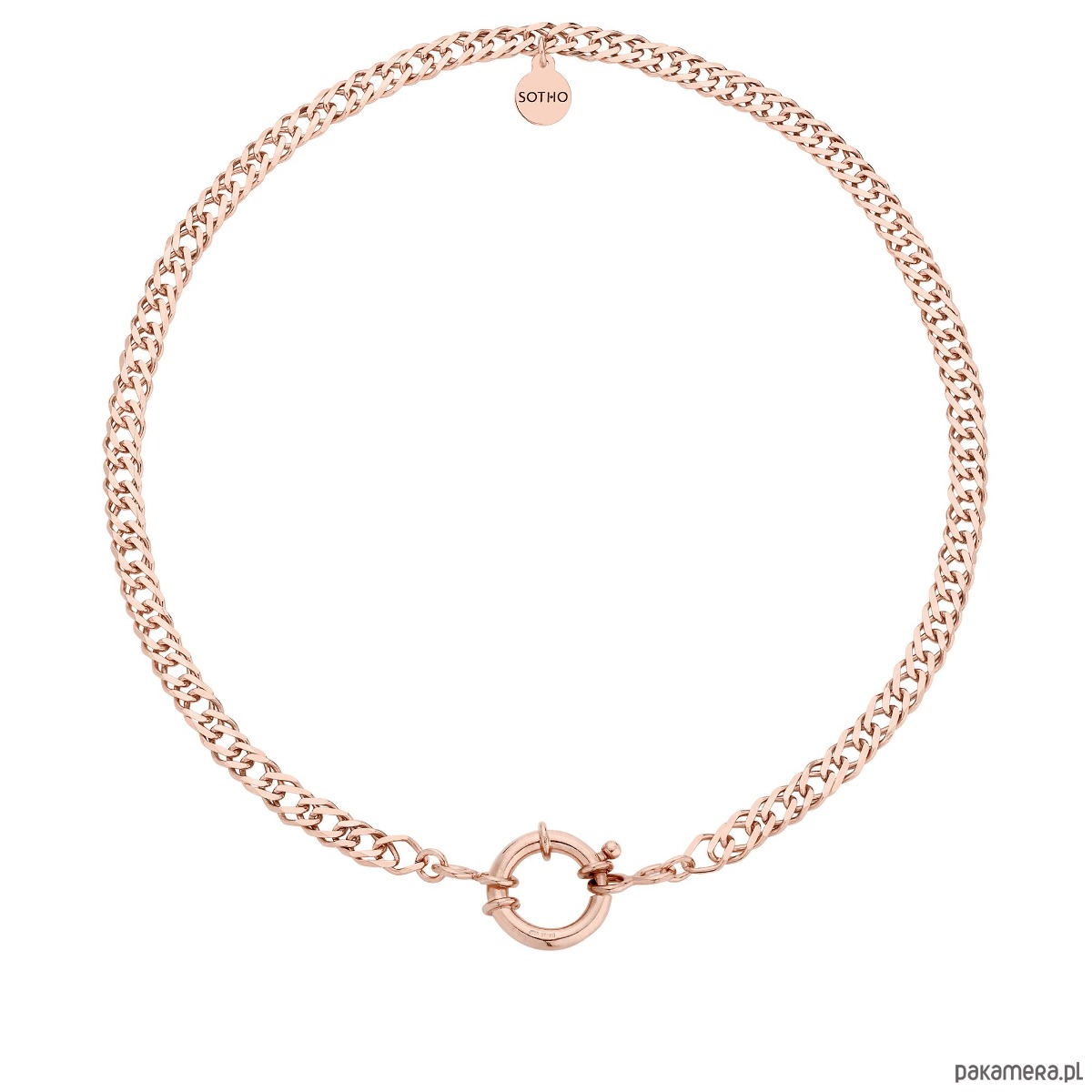Złoty masywny łańcuch zdobiony zawieszką z logo marki. Całość wykonana ze srebra 925 powlekanego 18 karatowym różowym złotem.