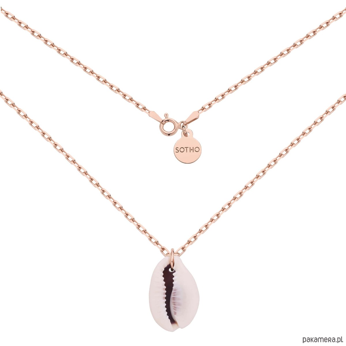 Złoty masywny łańcuszek z muszelką oraz zawieszką z logo marki. Całość wykonana ze srebra 925 powlekanego 18 karatowym różowym złotem.