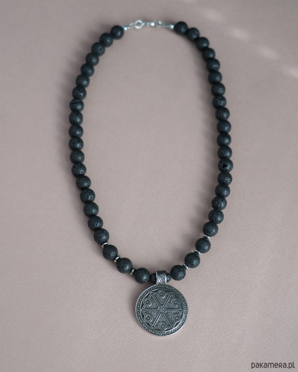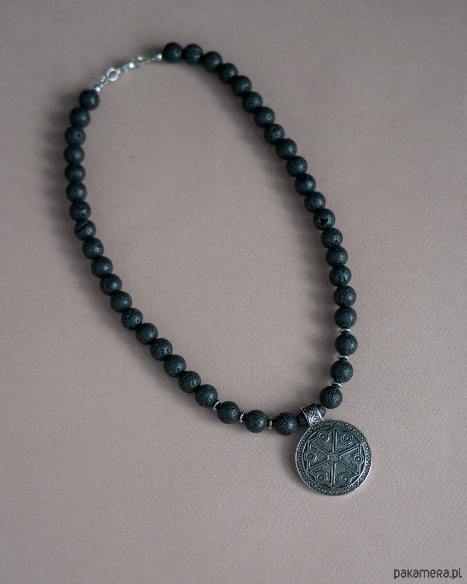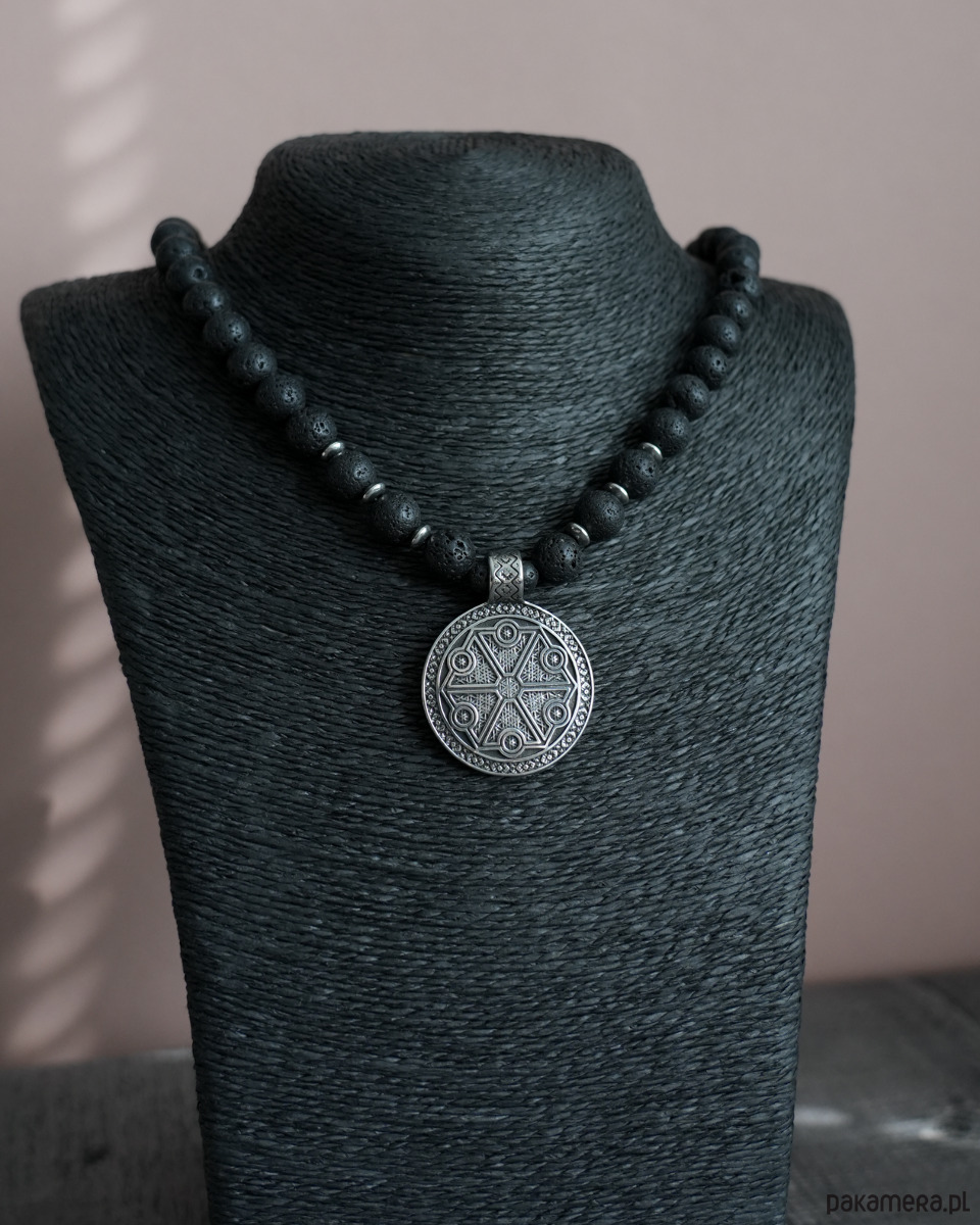 Naszyjnik jest w całości wykonany z surowej LAWY WULKANICZNEJ oraz STALI SZLACHETNEJ.
