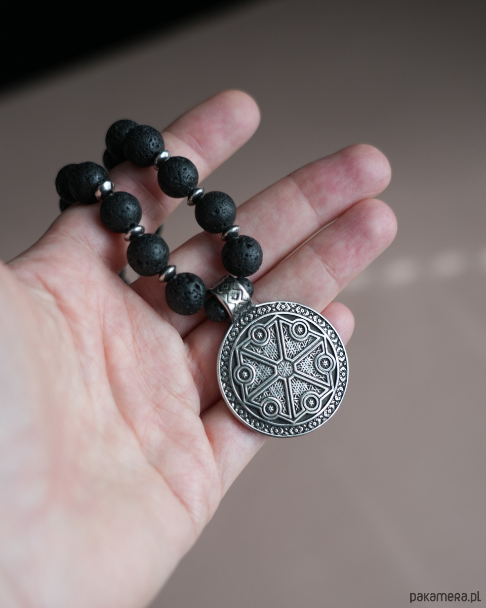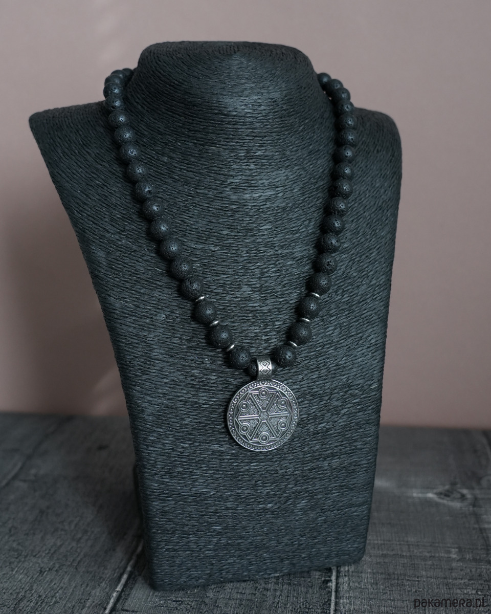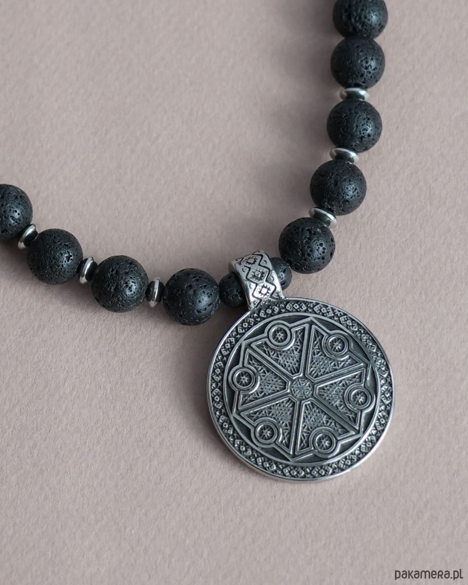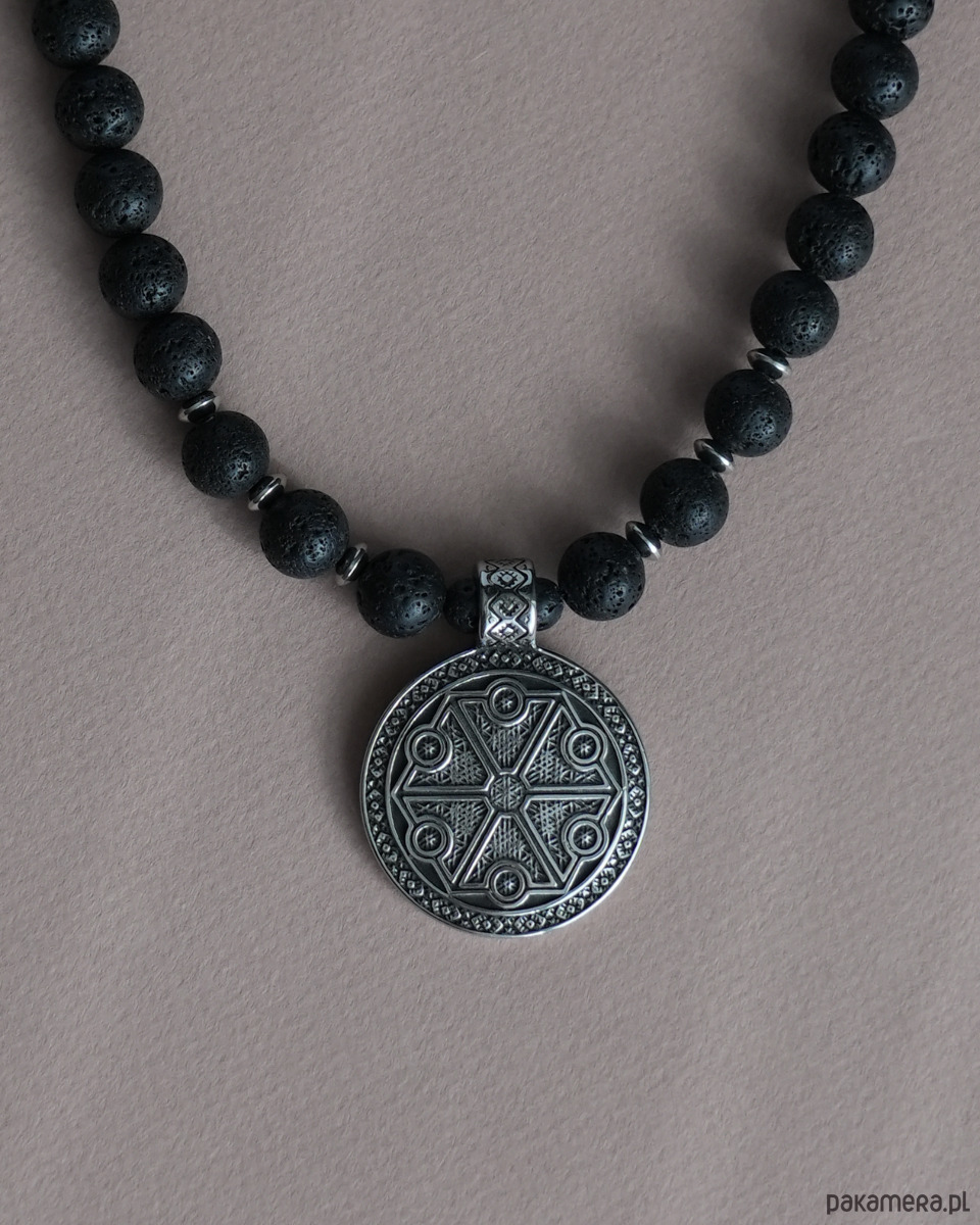 Naszyjnik jest w całości wykonany z surowej LAWY WULKANICZNEJ oraz STALI SZLACHETNEJ.