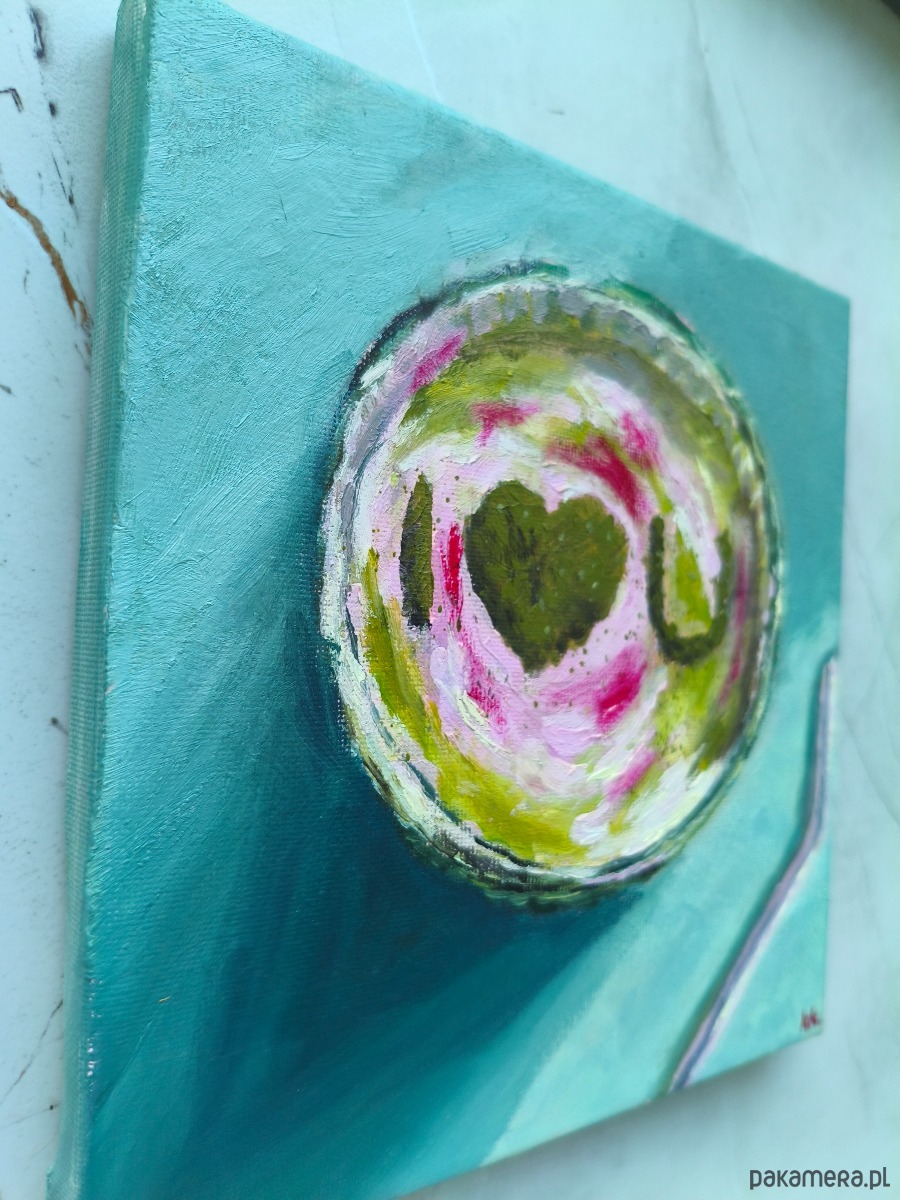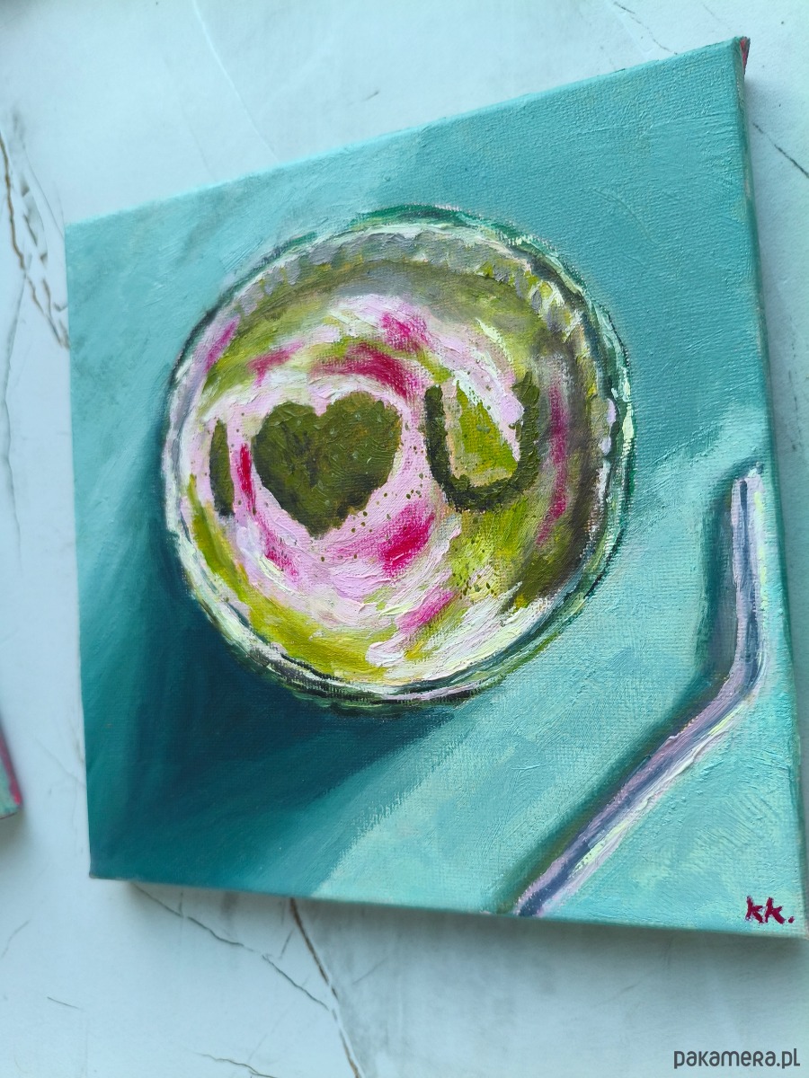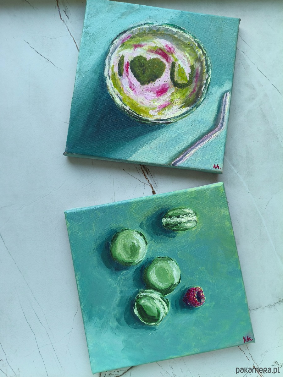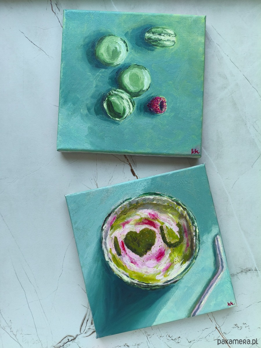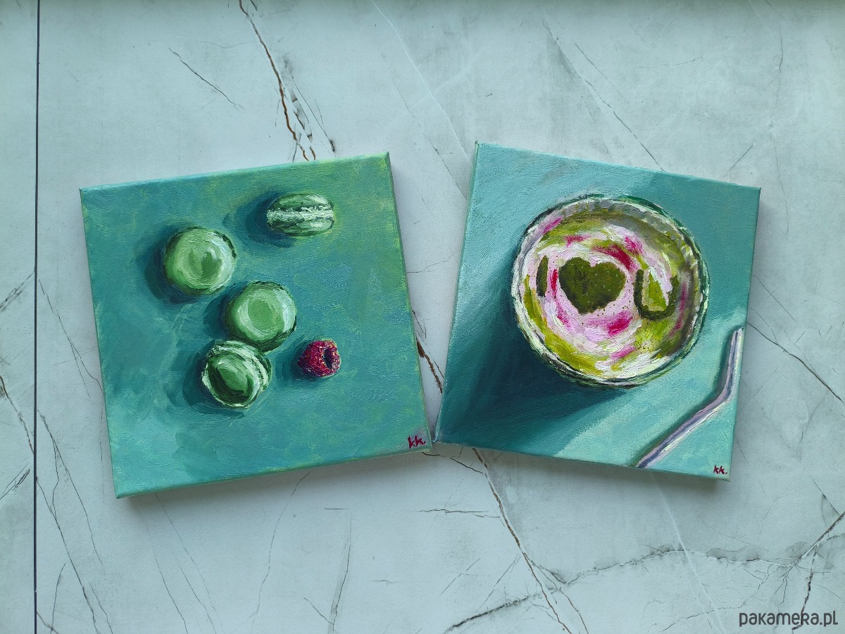 „Matcha Lovers” to komplet dwóch ręcznie malowanych obrazów olejnych na płótnie, inspirowanych estetyką matchy, rytuałem uważności i spokojem codziennych momentów.