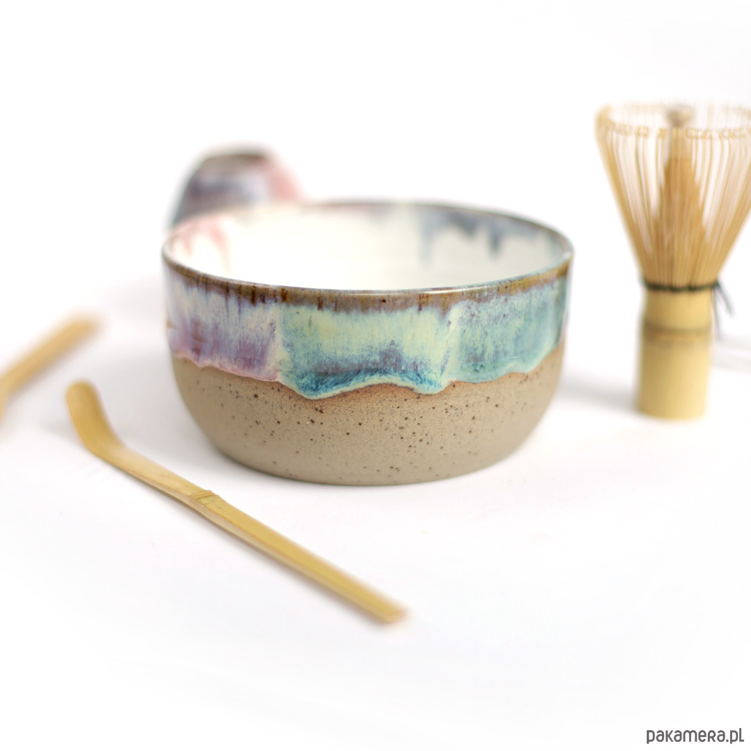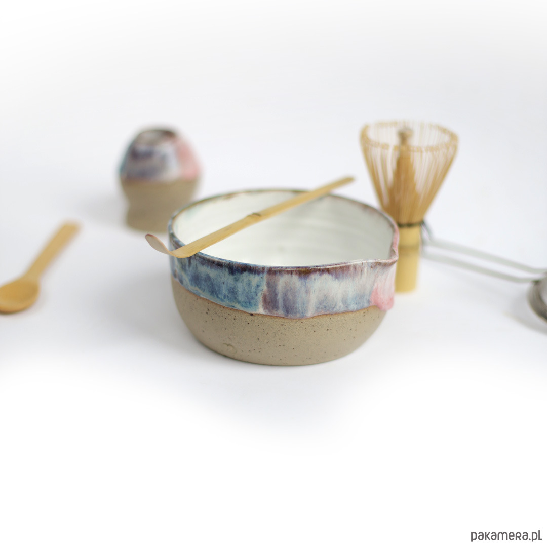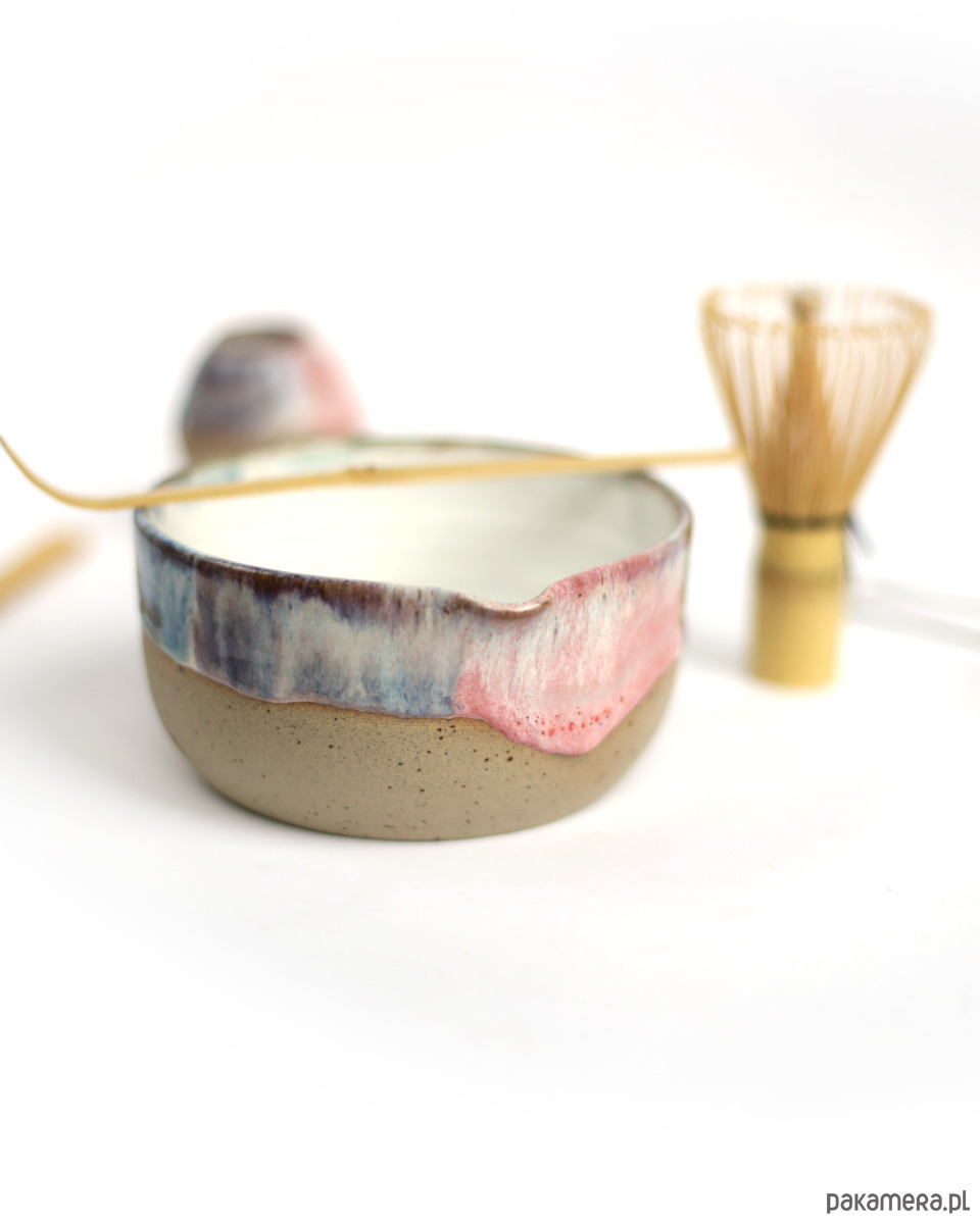 ∙ ceramiczna miseczka – inspirowana tradycyjnym chawanem, wyposażona w praktyczny dziubek ułatwiający przelewanie napoju, toczona na kole z nakrapianej gliny. Wymiary: ok. 6,5 cm wysokości i 12,5 cm średnicy.