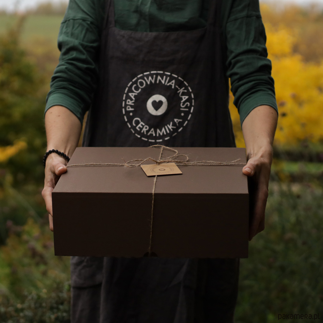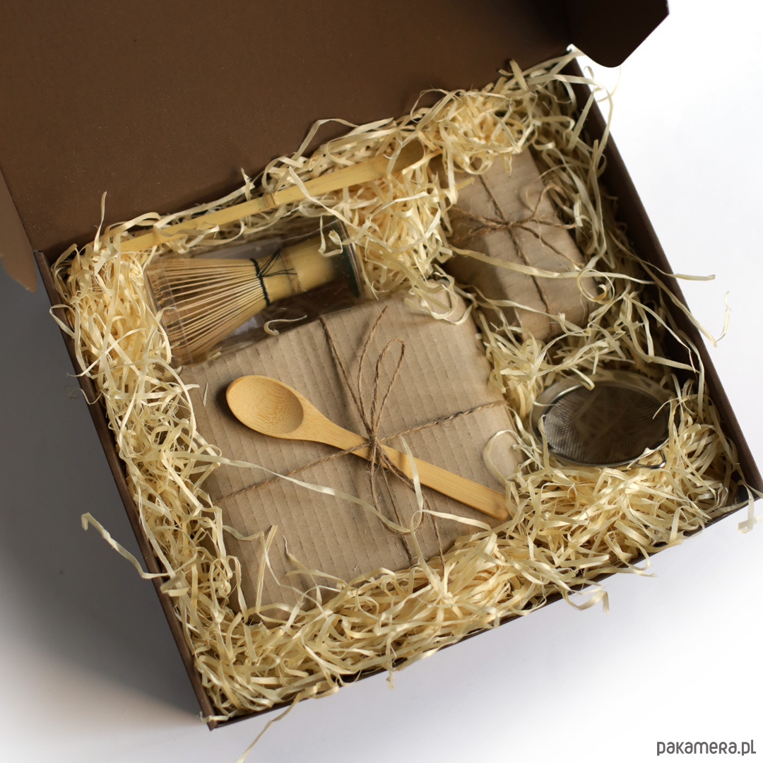 Całość zapakowana jest w eleganckie, brązowe pudełko wyściełane naturalną wełną drzewną, co nadaje zestawowi wyjątkowy charakter i czyni go