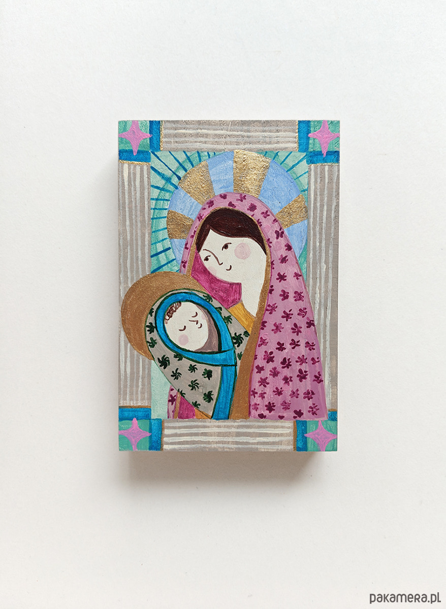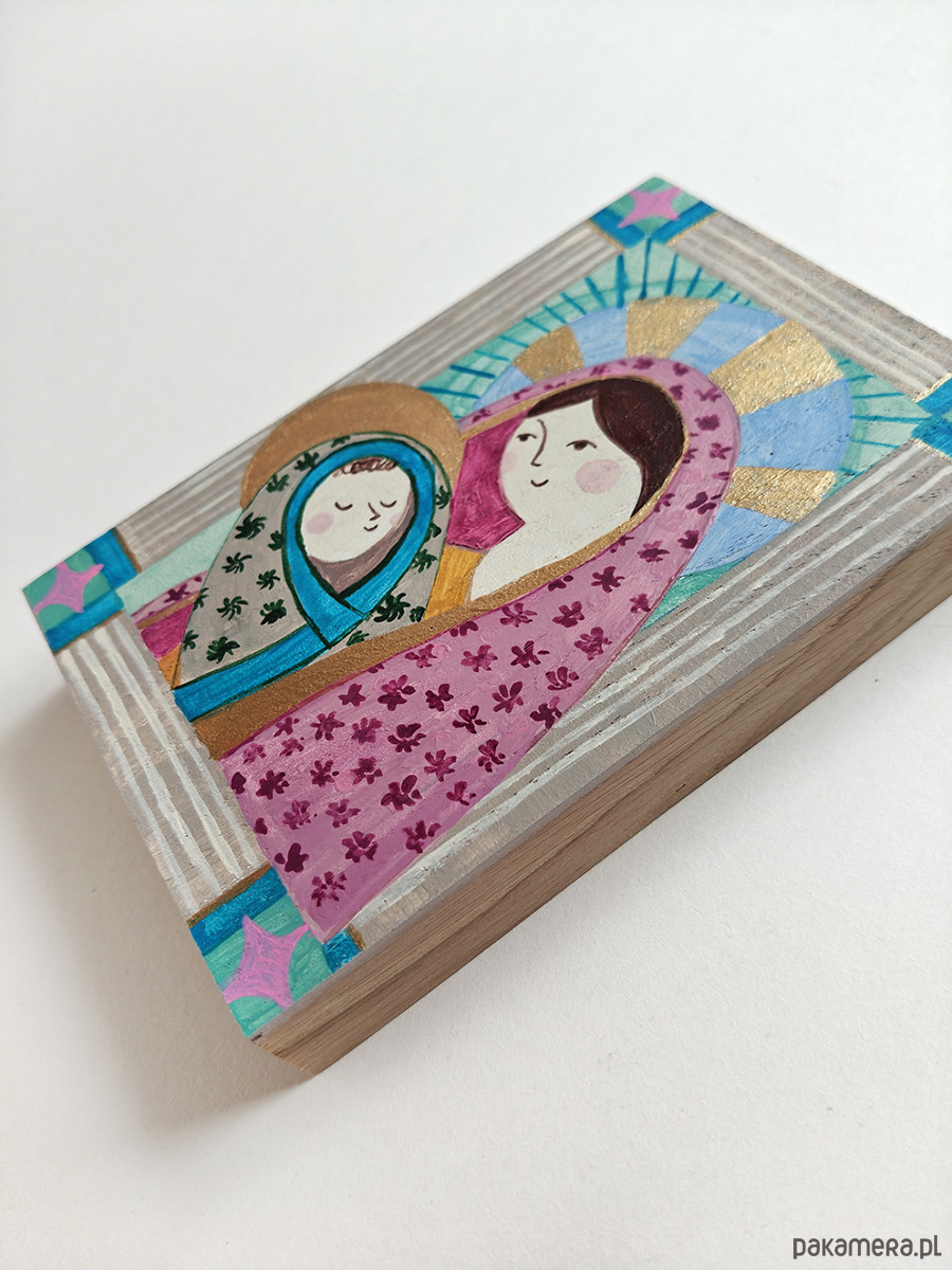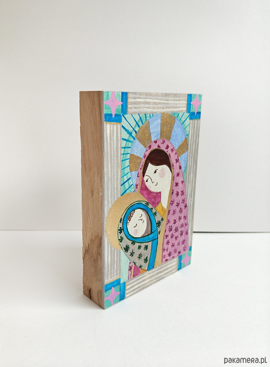 Ręcznie malowana Matka Boska z Dzieciątkiem. Każdy egzemplarz jest unikatowy. Delikatna, symboliczna forma – idealna jako dekoracja wnętrza lub wyjątkowy prezent.