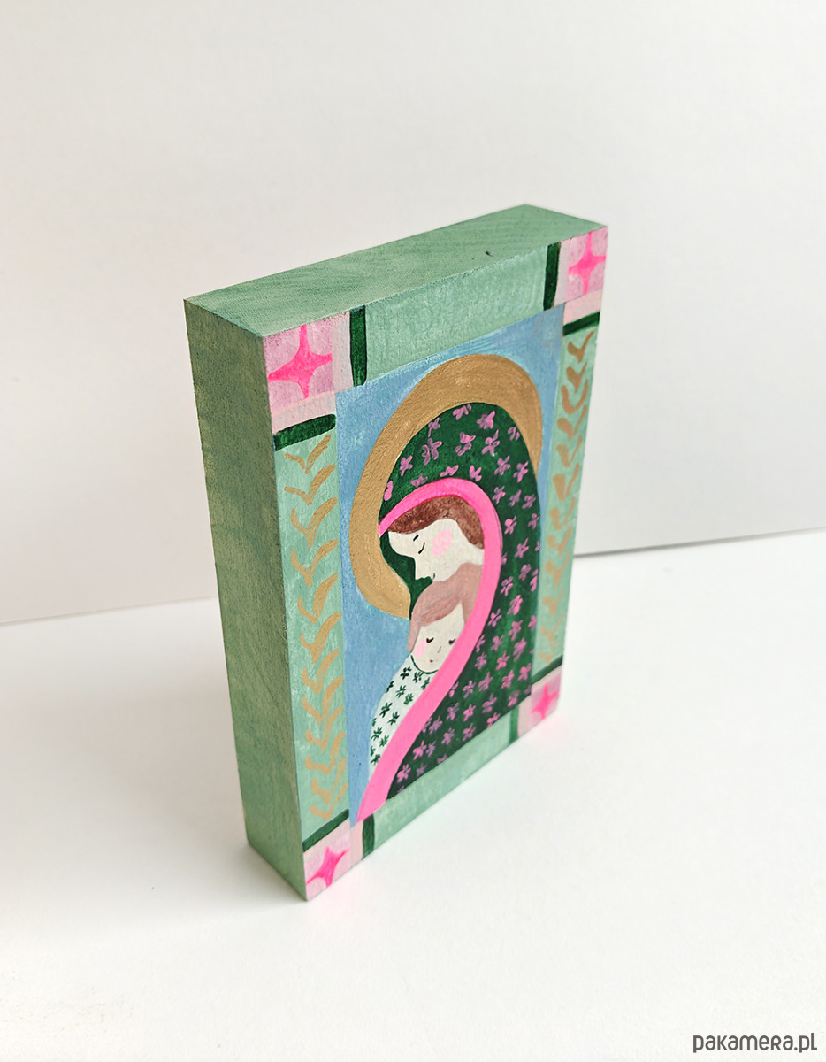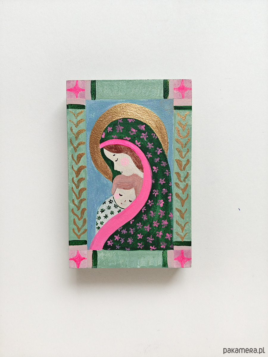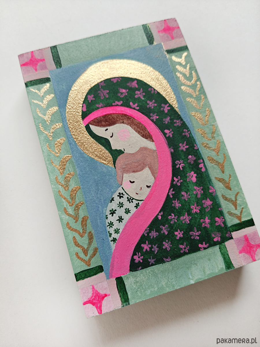 Ręcznie malowana Matka Boska z Dzieciątkiem. Każdy egzemplarz jest unikatowy. Delikatna, symboliczna forma – idealna jako dekoracja wnętrza lub wyjątkowy prezent.