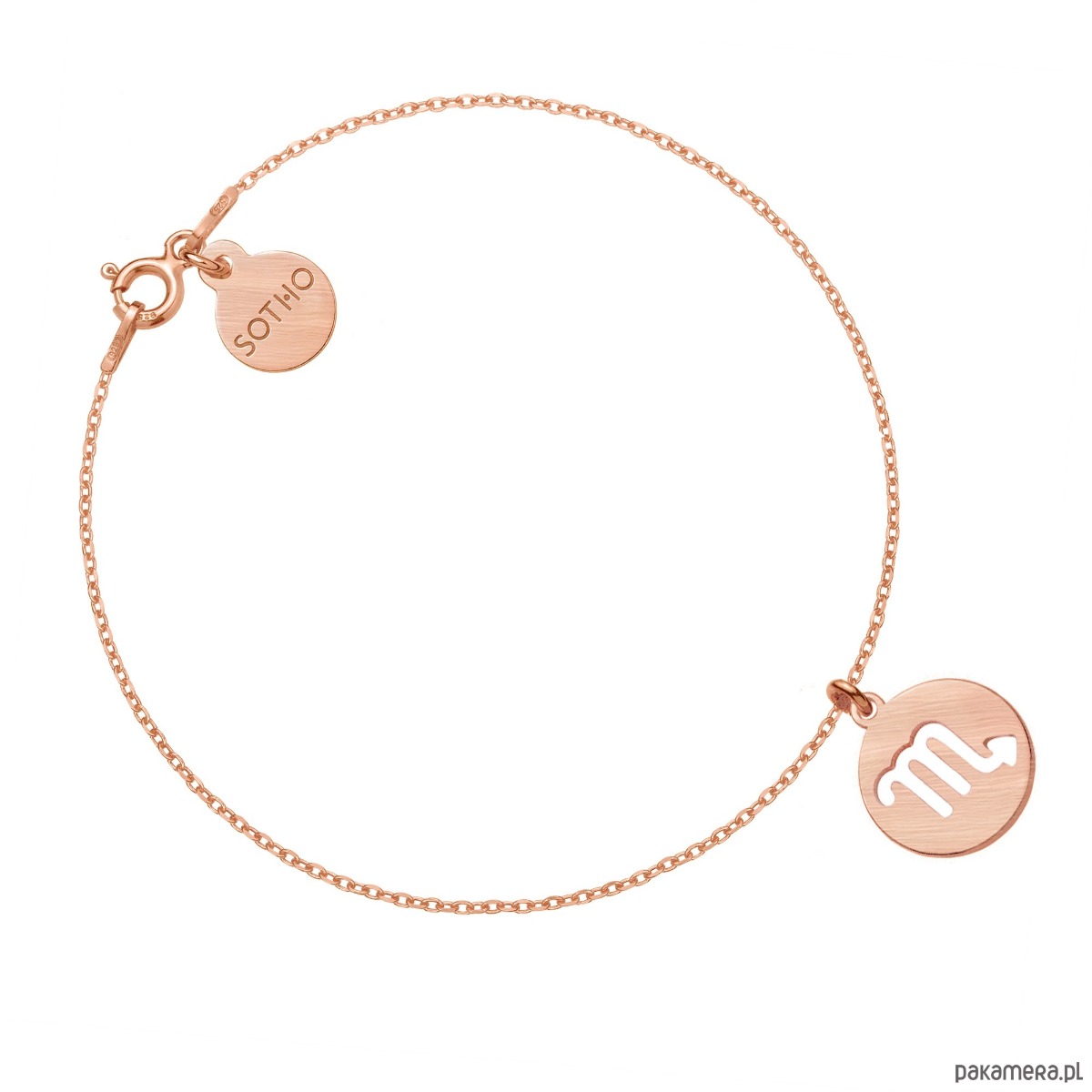 Złota matowa bransoletka łańcuszkowa zdobiona znakiem zodiaku Skorpiona i zawieszką z logo marki. Całość wykonana ze srebra 925 powlekanego 18 karatowym różowym złotem.