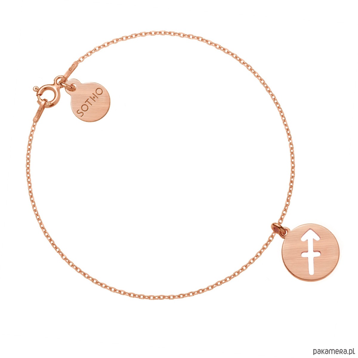 Złota matowa bransoletka łańcuszkowa zdobiona znakiem zodiaku Strzelca i zawieszką z logo marki. Całość wykonana ze srebra 925 powlekanego 18 karatowym różowym złotem.