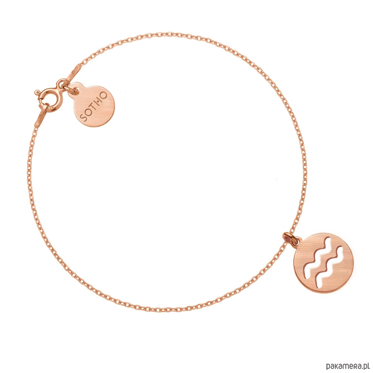 Złota matowa bransoletka łańcuszkowa zdobiona znakiem zodiaku Wodnika i zawieszką z logo marki. Całość wykonana ze srebra 925 powlekanego 18 karatowym różowym złotem.