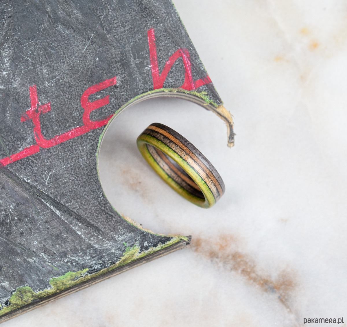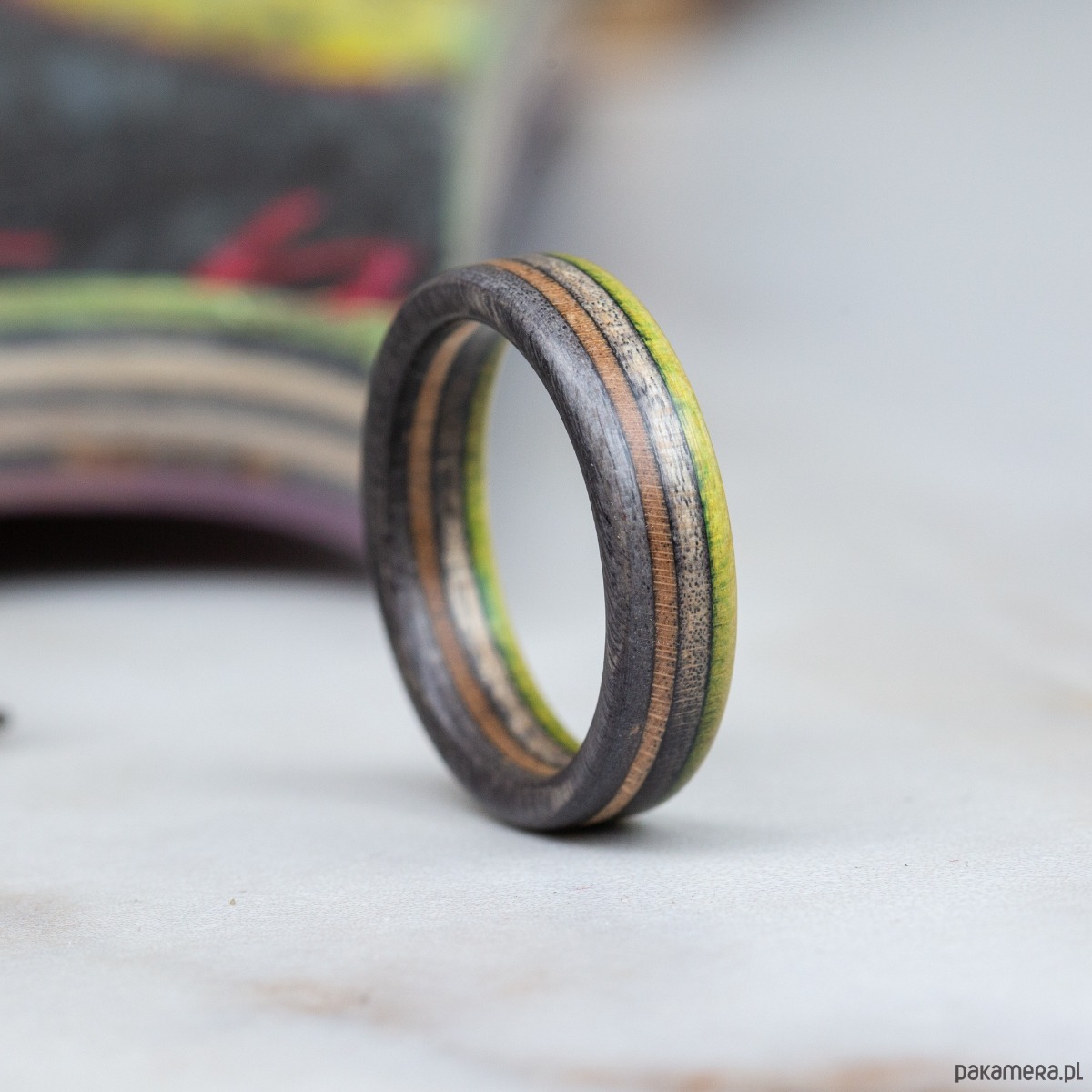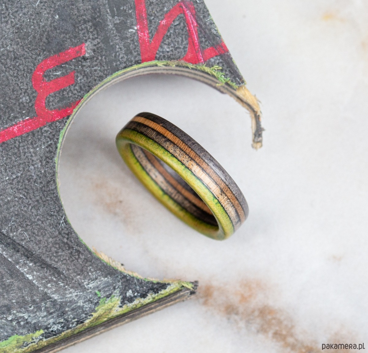 Matowa drewniana obrączka wykonana z kanadyjskiego klonu pozyskanego ze zużytych blatów deskorolkowych (recycled skateboard wood). Każda deska ma swoją historię, a my nadajemy jej drugie życie, tworząc unikatową biżuterię o wyrazistych, naturalnych warstwach kolorystycznych. Obrączka ma szerokość 5,5 mm, co czyni ją lekką, wygodną i codzienną, a jednocześnie charakterystyczną dzięki kontrastowym pasom drewna.