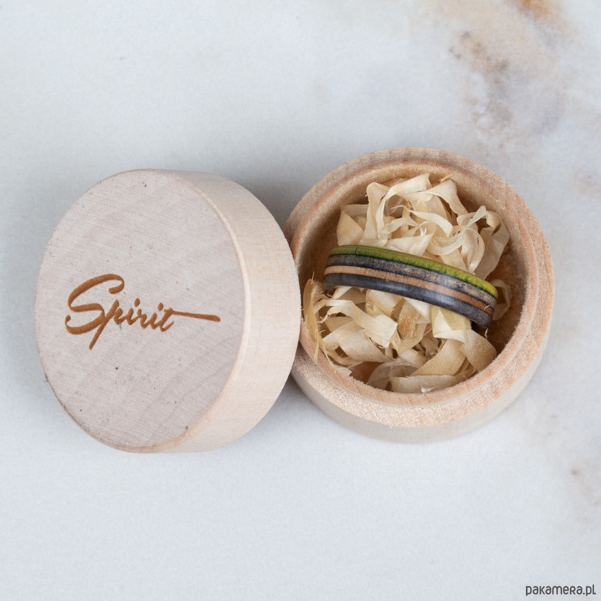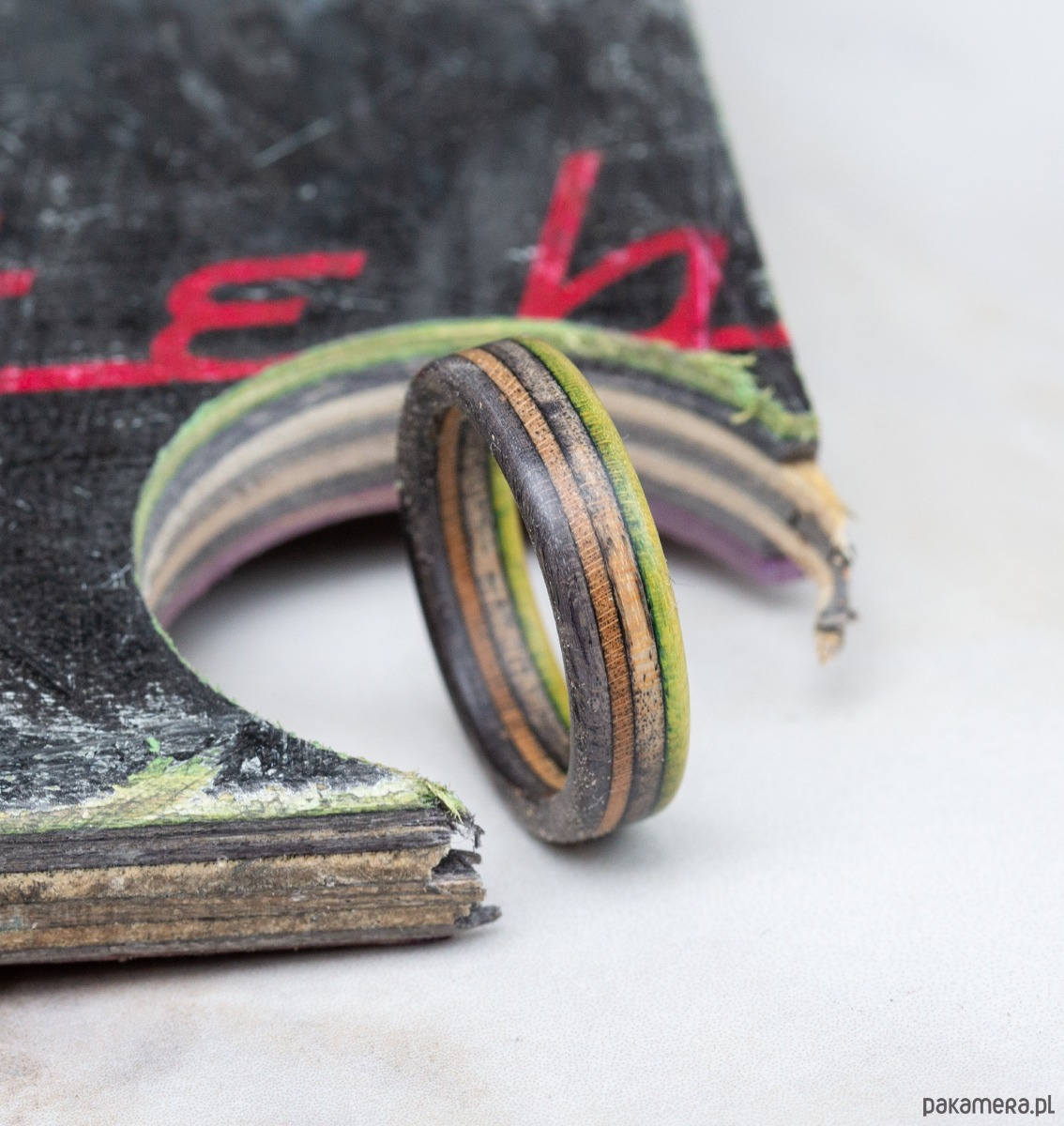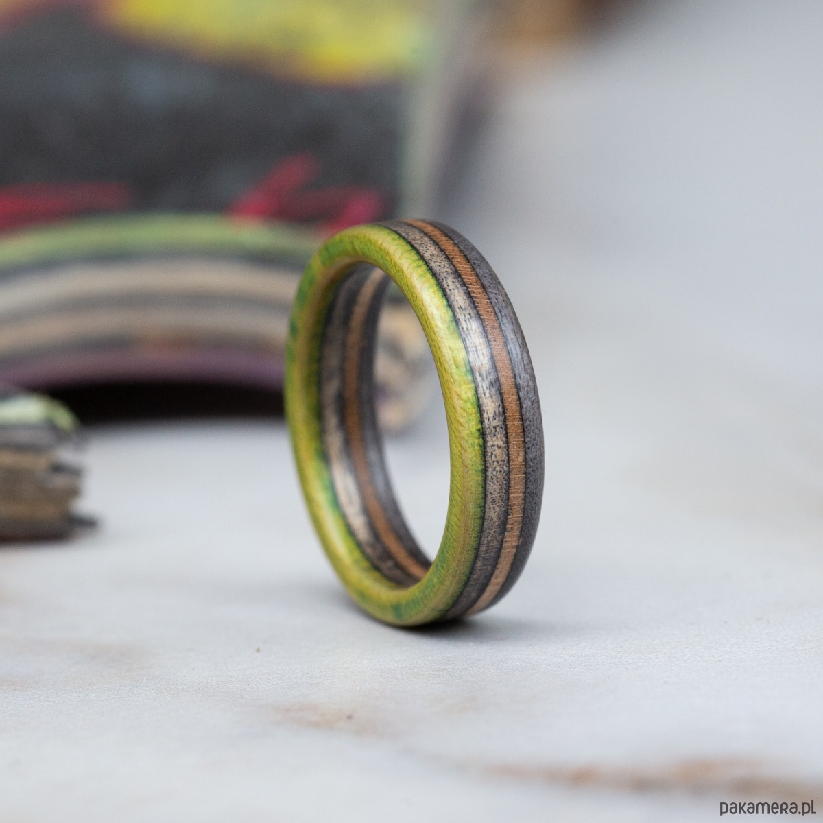 Matowa drewniana obrączka wykonana z kanadyjskiego klonu pozyskanego ze zużytych blatów deskorolkowych (recycled skateboard wood). Każda deska ma swoją historię, a my nadajemy jej drugie życie, tworząc unikatową biżuterię o wyrazistych, naturalnych warstwach kolorystycznych. Obrączka ma szerokość 5,5 mm, co czyni ją lekką, wygodną i codzienną, a jednocześnie charakterystyczną dzięki kontrastowym pasom drewna.