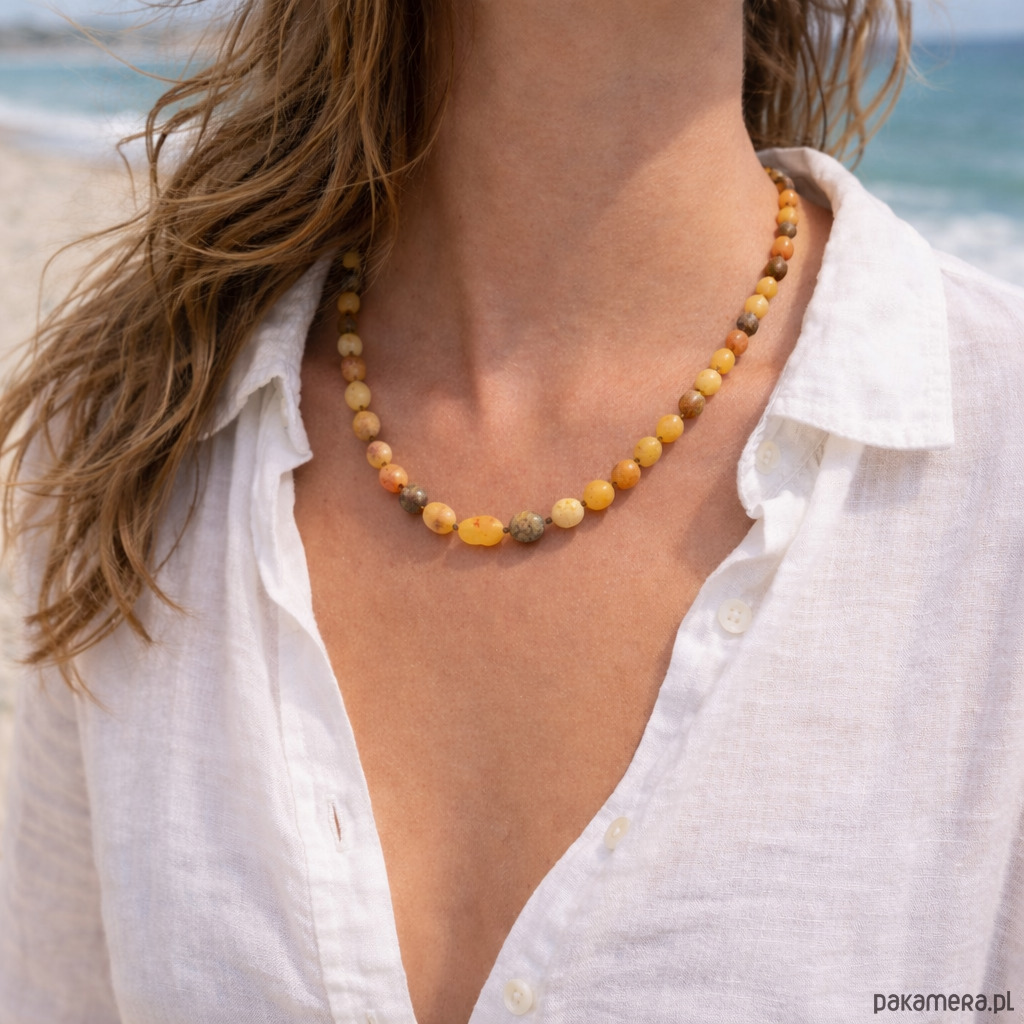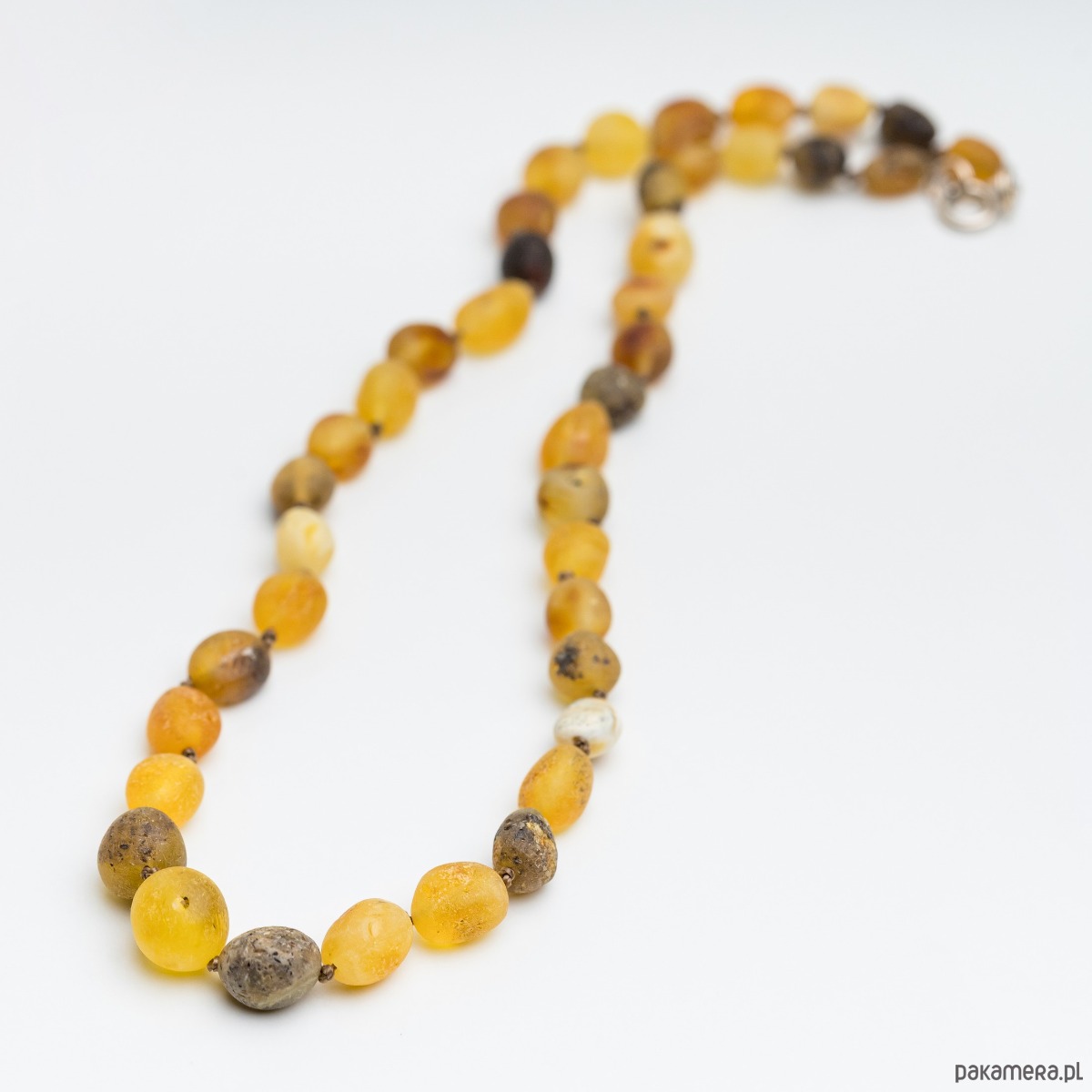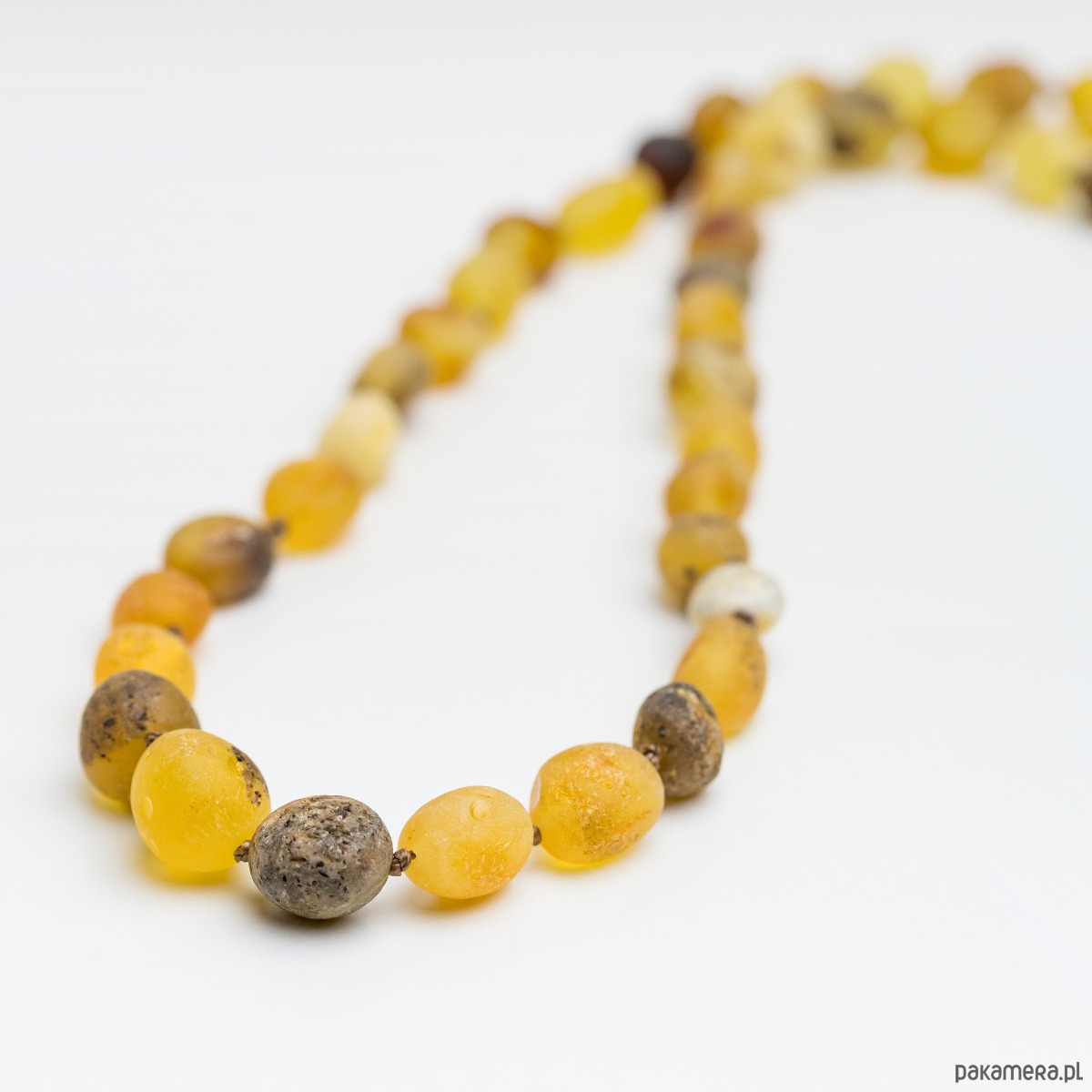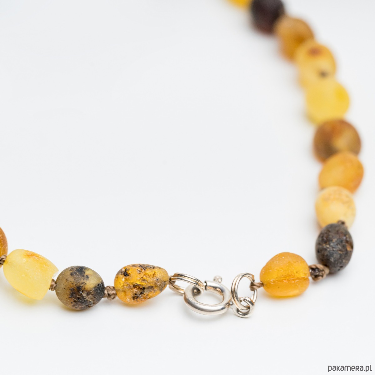 Naszyjnik został wykonany z naturalnego bursztynu bałtyckiego w odcieniach koniaku, żółci oraz czerni. Matowe, oliwkowe koraliki nawleczono na wytrzymały sznurek, a całość wykończono solidnym zapięciem typu karabińczyk ze srebra próby 925.