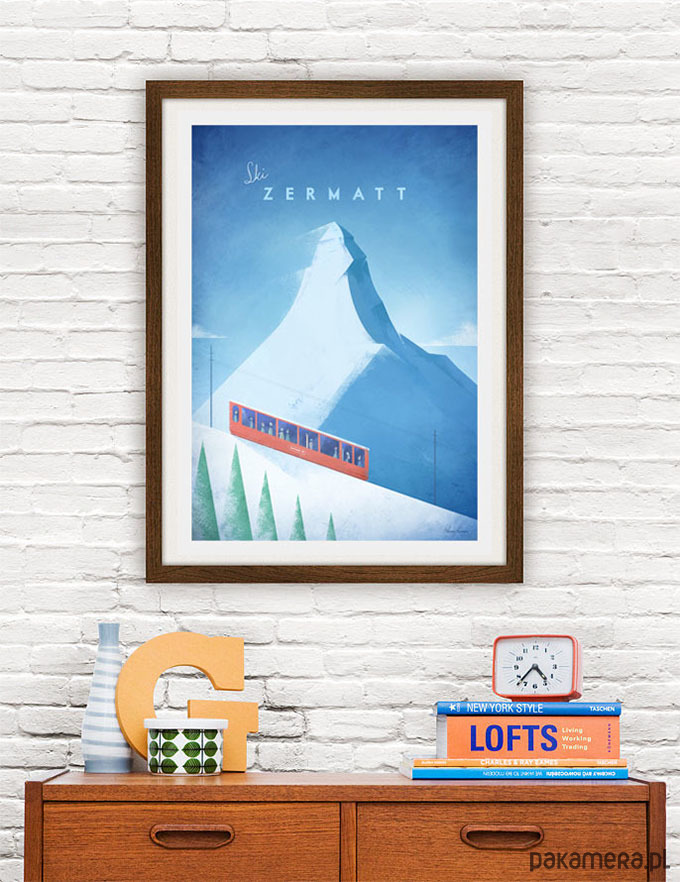 Plakat w stylu vintage przedstawiający kolejkę zębatą na górski grzbiet Gornergrat w szwajcarskim kurorcie Zermatt. W tle widnieje ikoniczny szczyt Matterhorn. Grafika inspirowana plakatami podróżniczymi z lat 20-tych XX wieku.