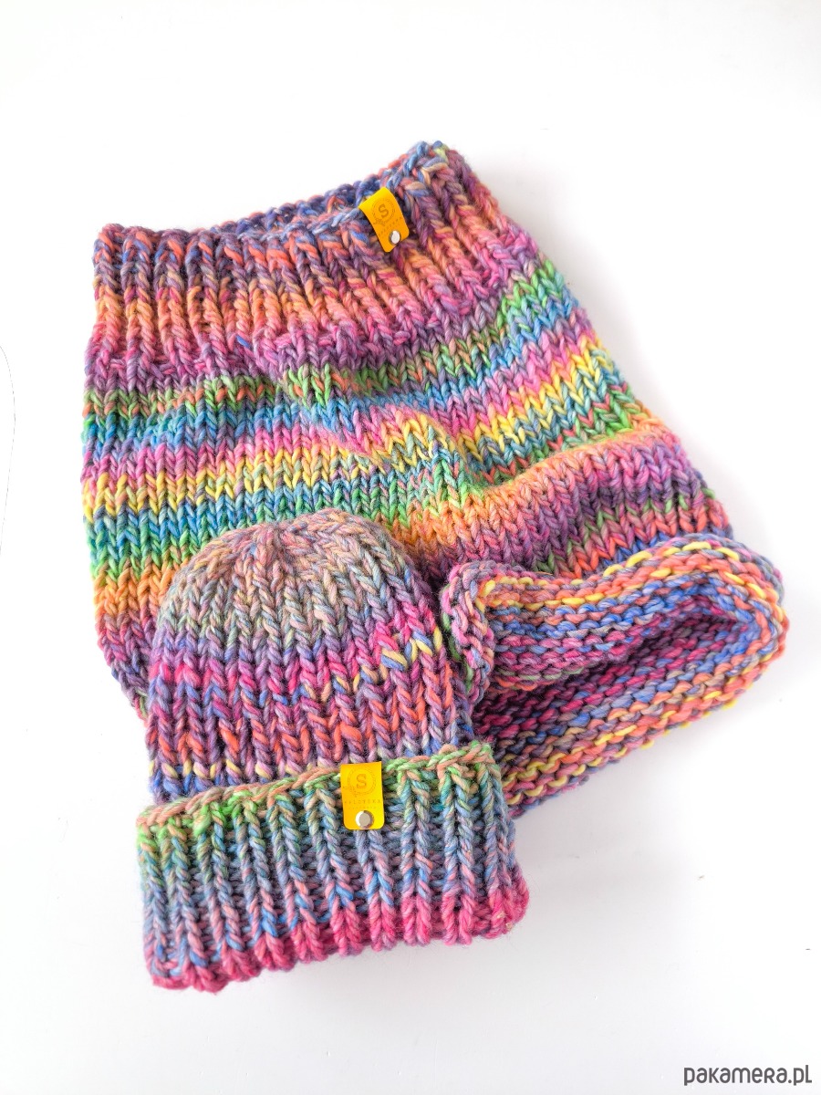 Czapka i komin są proste w formie za to wyróżniają je oryginalne przejścia kolorystyczne.