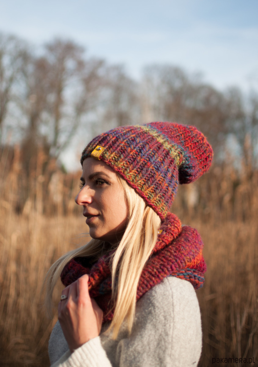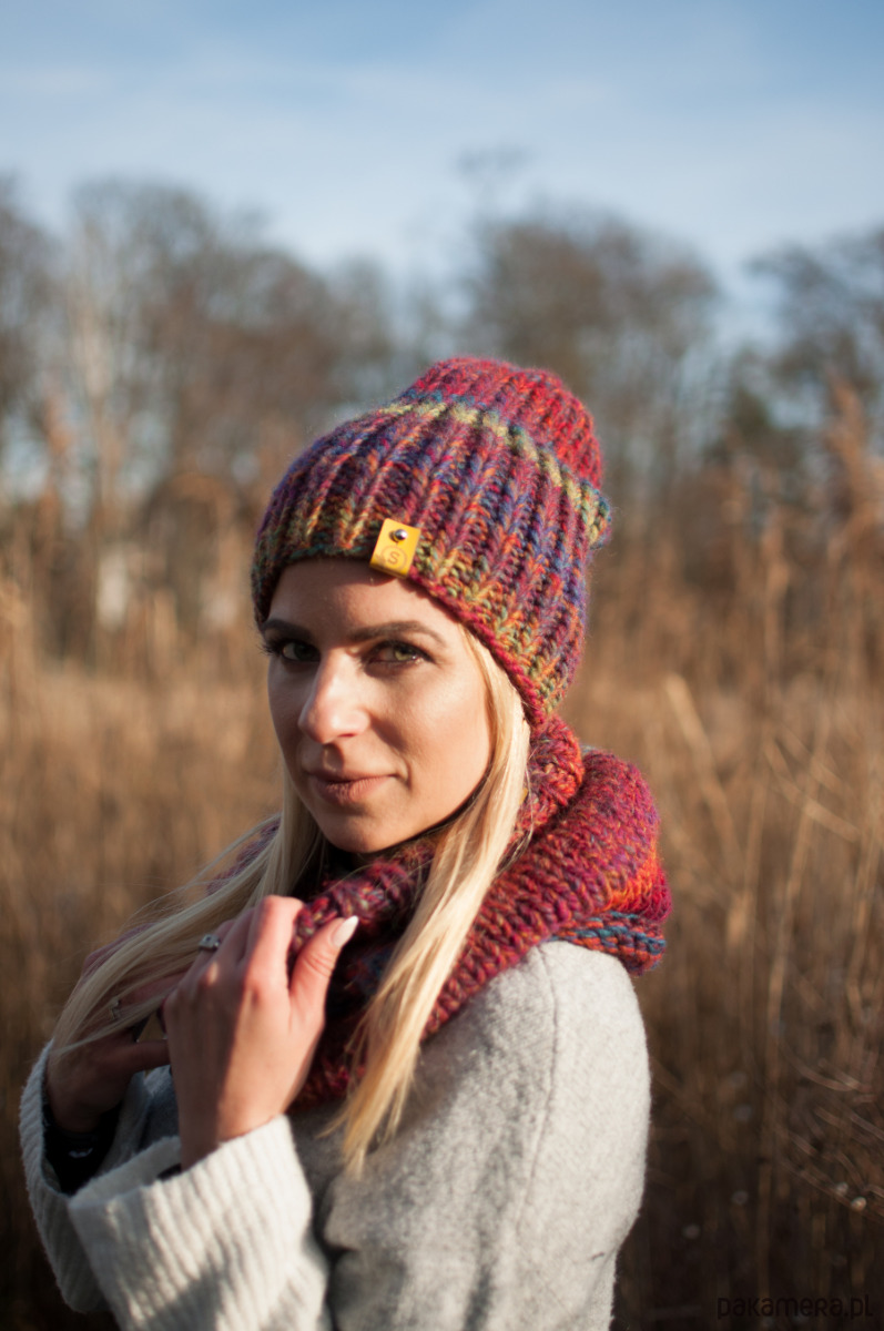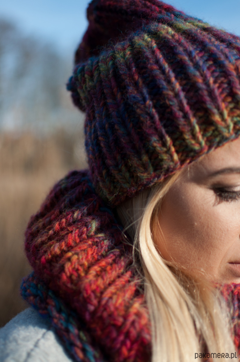 Czapka i komin są proste w formie za to wyróżniają je oryginalne przejścia kolorystyczne.