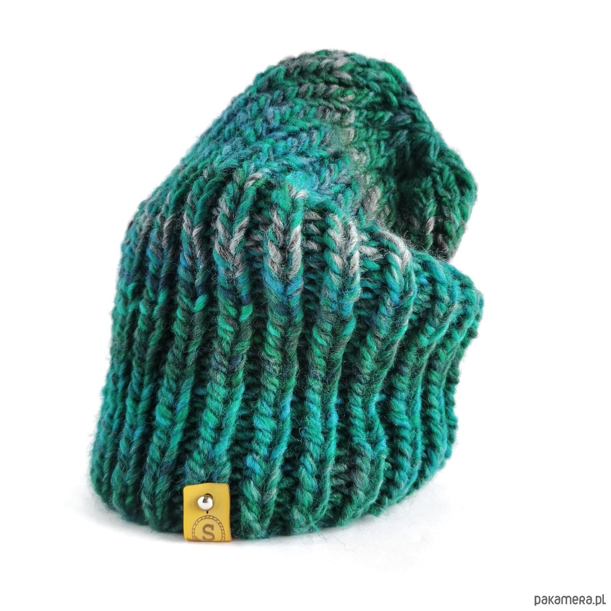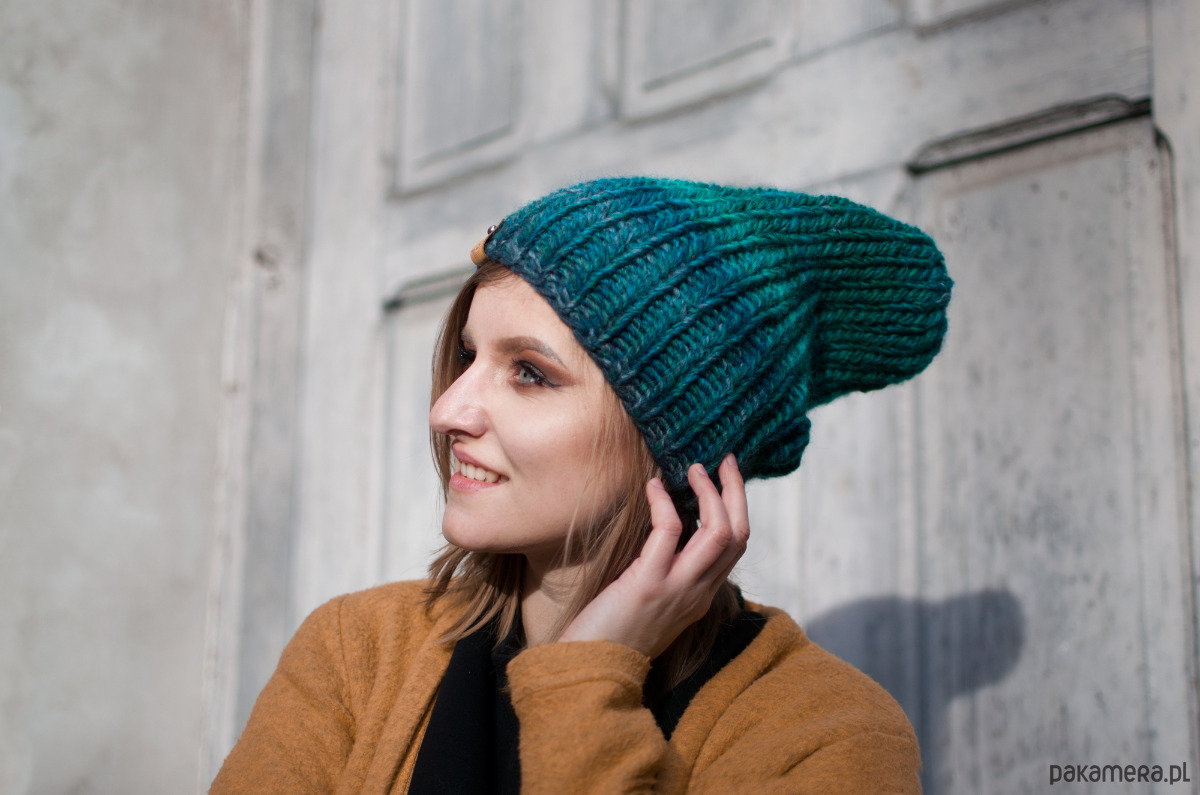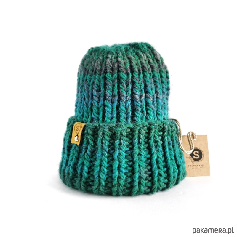 Czapka o prostej formie, w cudnym odcieniu głębokiej melanżowej zieleni z