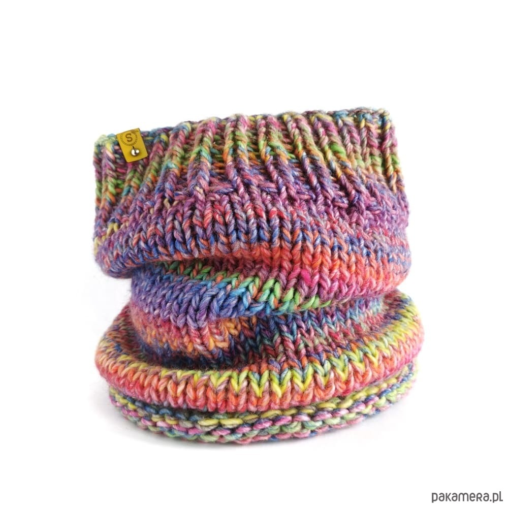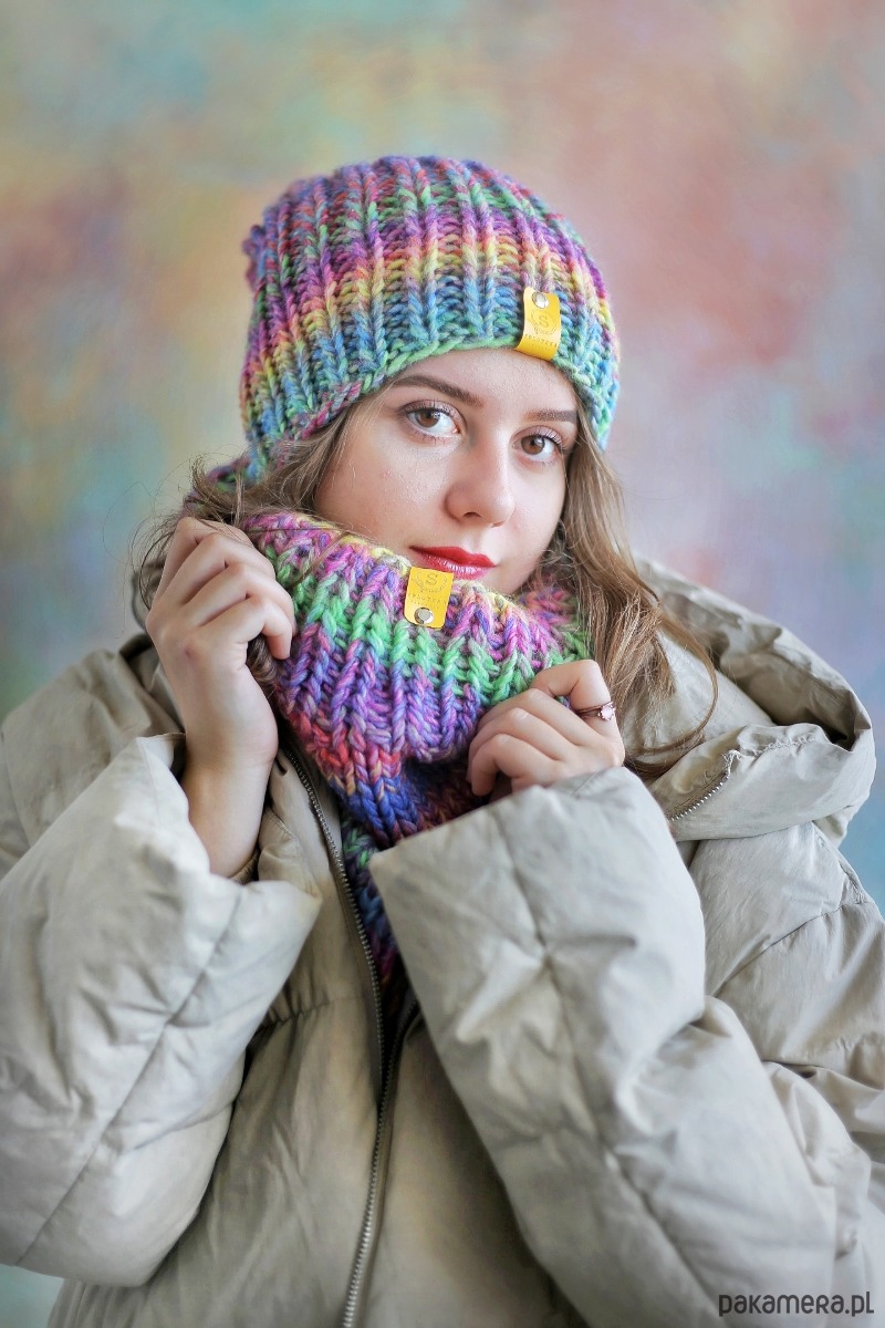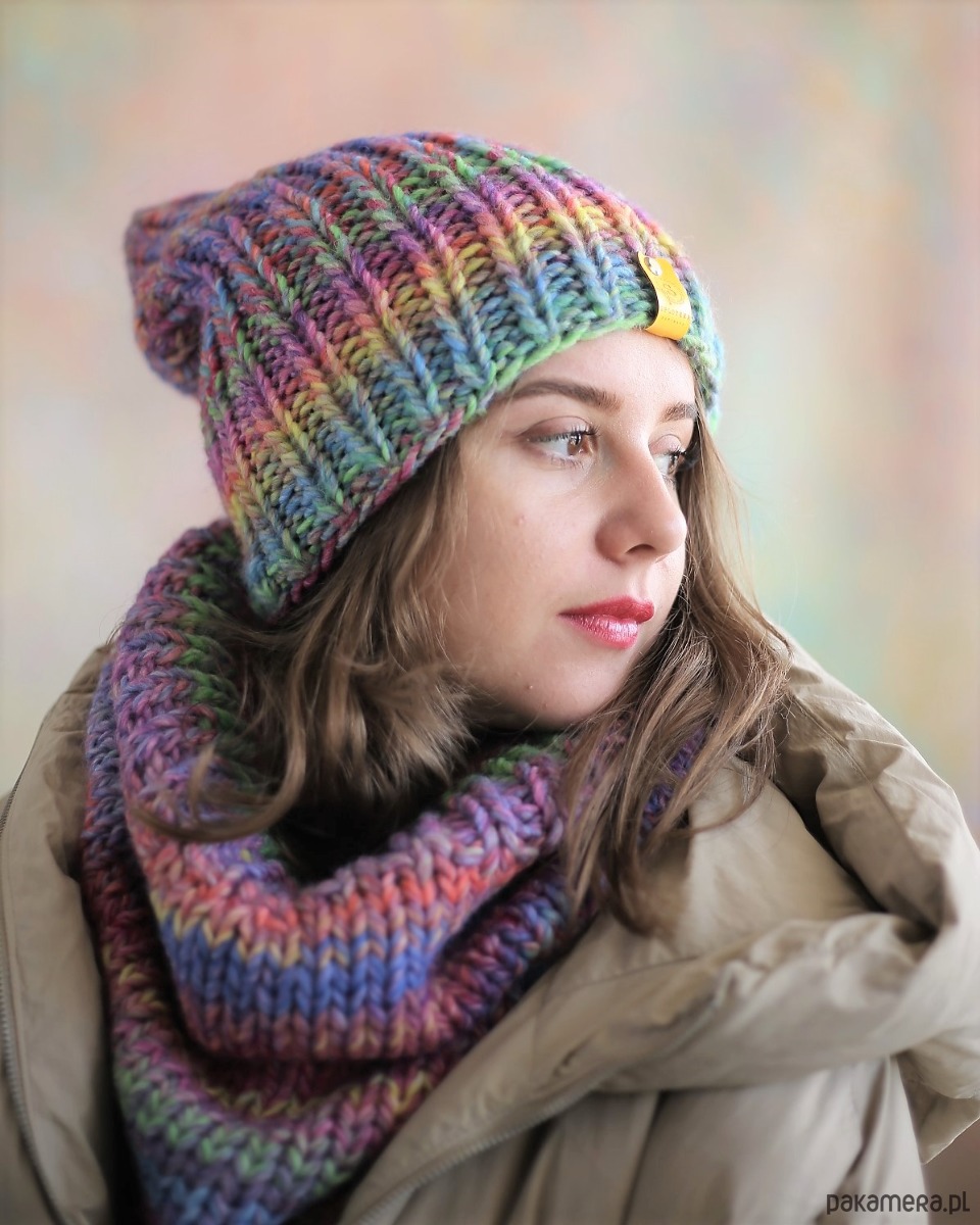 Czapka i komin są proste w formie za to wyróżniają je oryginalne przejścia kolorystyczne.
