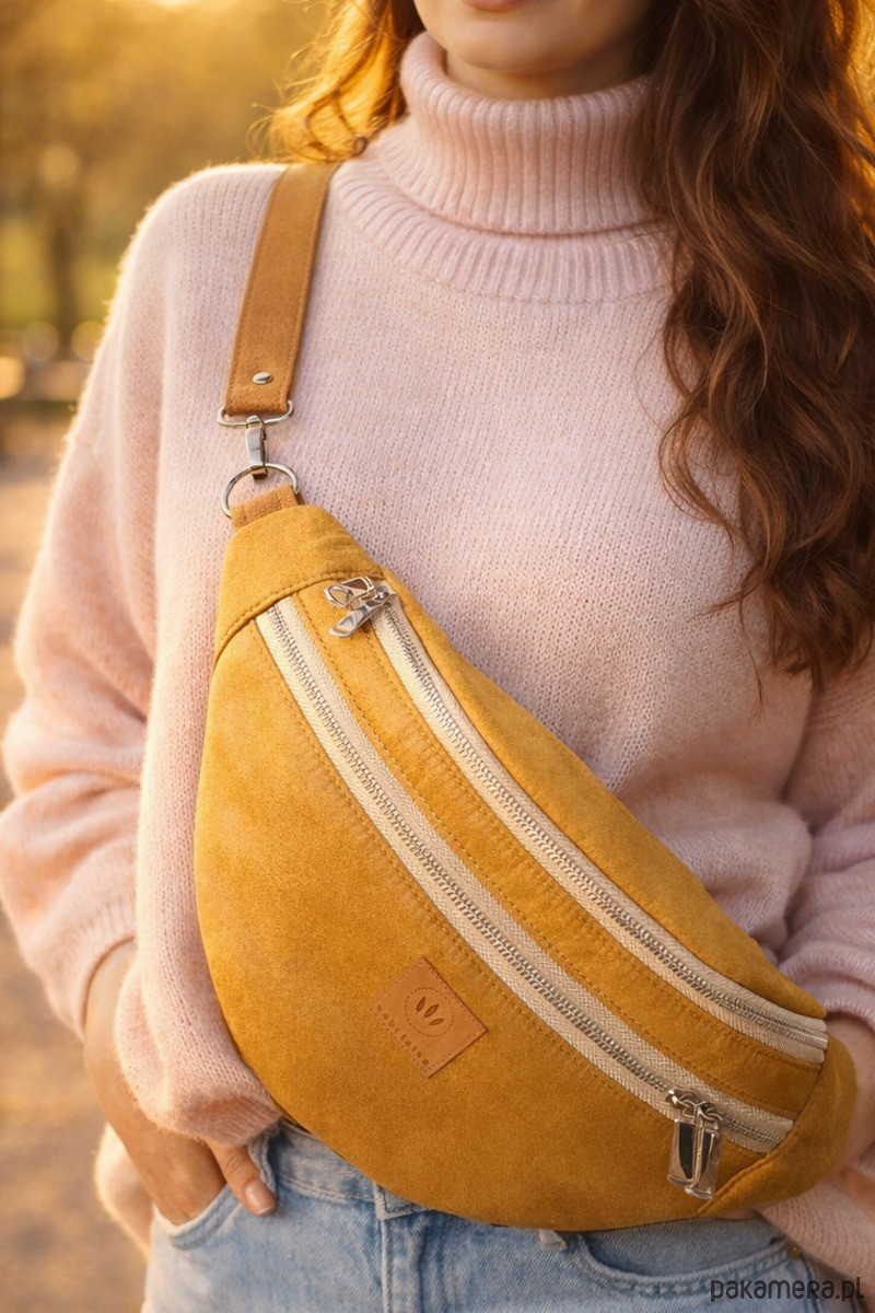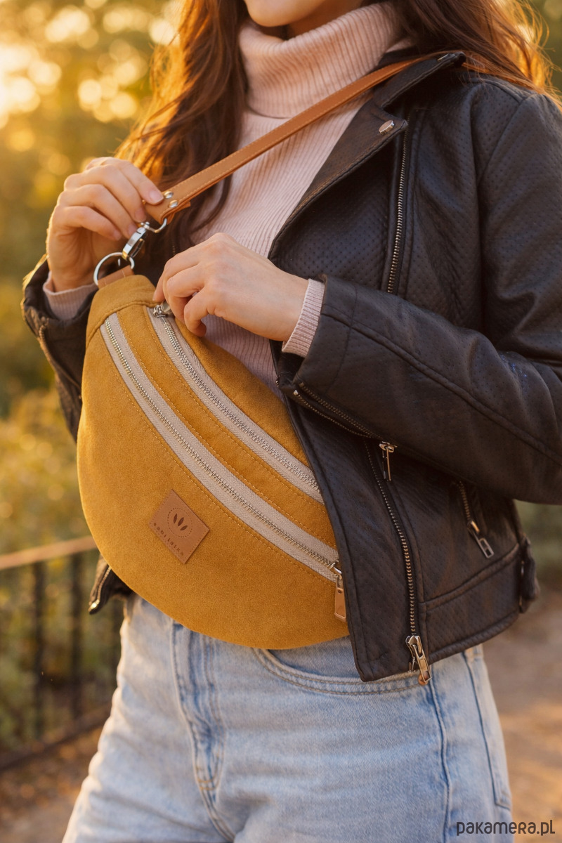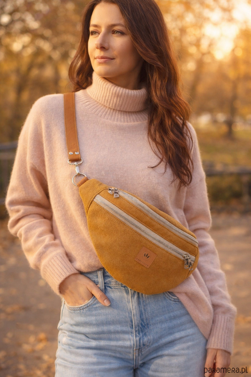 Bardzo duża nerka torebka damska z wysokiej jakości miodowego nubuku.