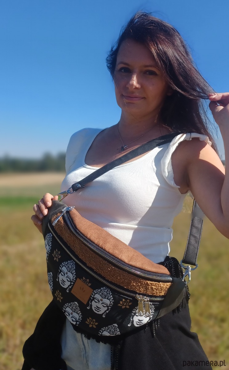 Bardzo duża nerka torebka damska z łączonych materiałów.
