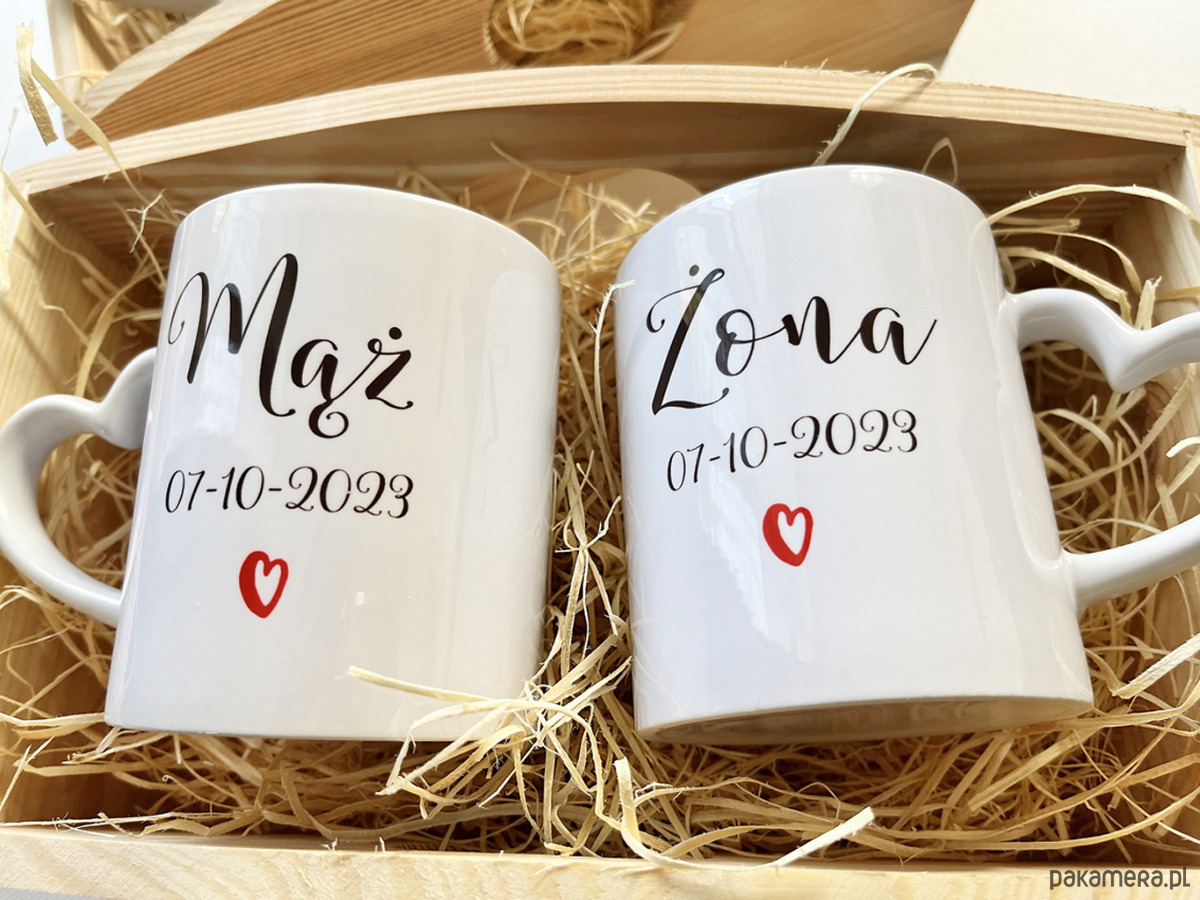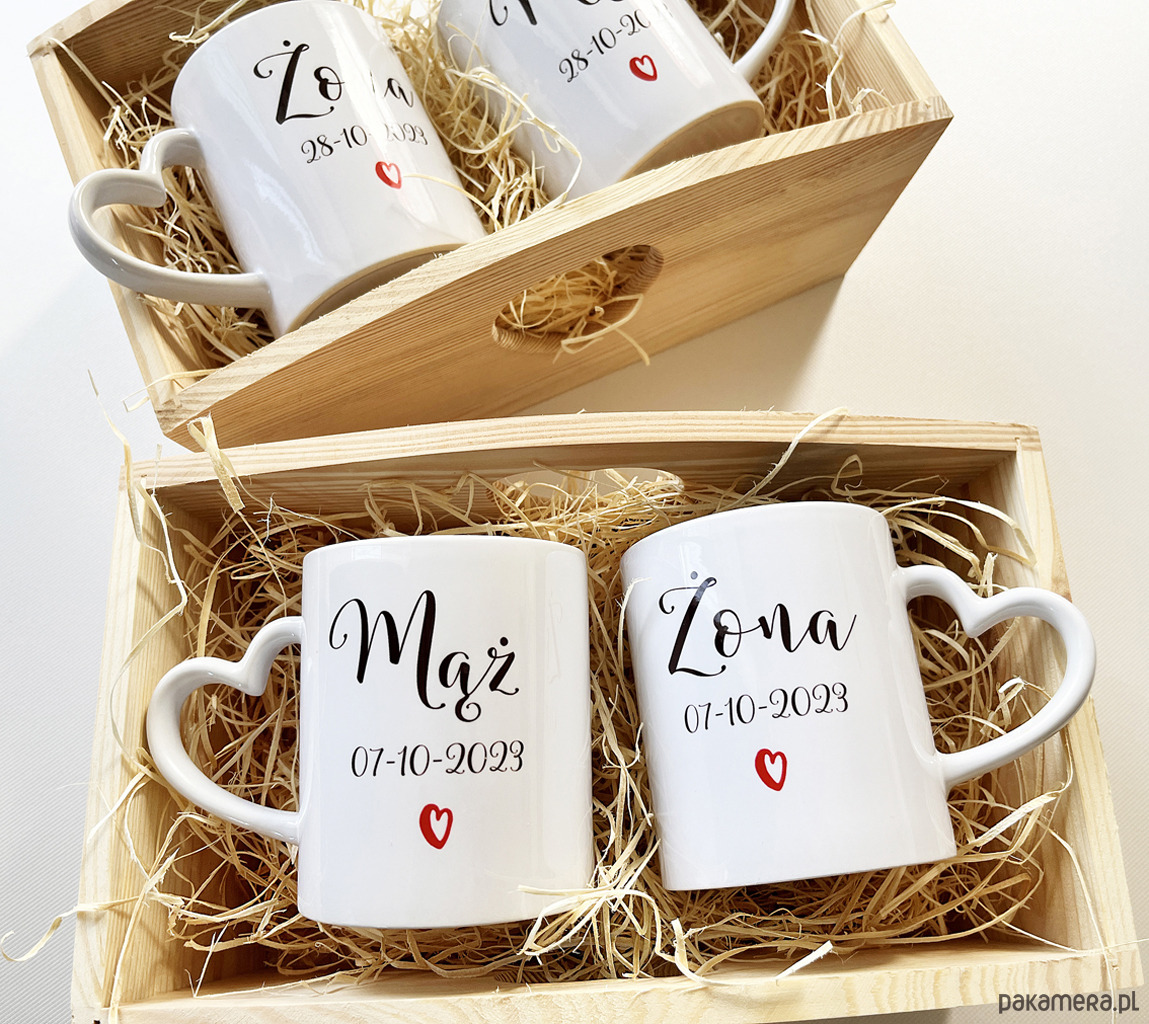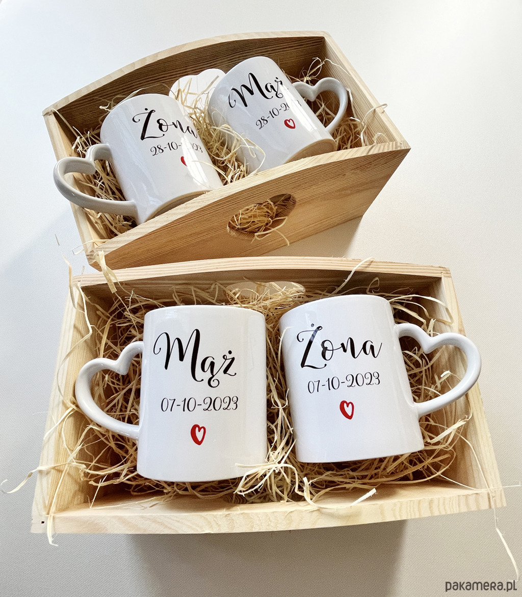 Duży, bardzo oryginalny, pięknie się prezentujący na stole czy biurku zestaw kubków ceramicznych z napisem Mąż ....data rocznicy... i Żona ...data rocznicy.. w kolorystyce czarno-biało-czerwonej z rączką w kształcie serca.Widoczne z daleka, dzięki ciekawej grafice, przyozdobią każde wnętrze i przypominać będą o wspaniałych chwilach przy każdej degustacji kawy czy herbaty, wywołując uśmiech na twarzach. Kubki są najwyższej jakości, mogą być zmywane w zmywarkach lub ręcznie, bardzo dobrze trzymają się w ręce, są wygodne i pojemne, dzięki czemu kawa czy herbata będzie w nich smakowała wyśmienicie.