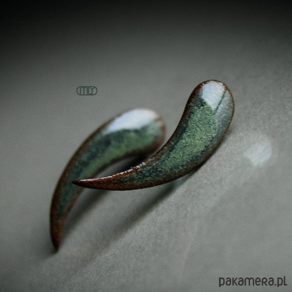 Ceramiczne podłużne kolczyki, ręcznie wykonane z delikatnej gliny kamionkowej, jednostronnie szkliwione mieszanką zielonych szkliw z efektem plamek, tył matowy czekoladowobrązowy na antyalergicznych sztyftach w kolorze srebrnym.długość ok 2,8cm. Polecam
