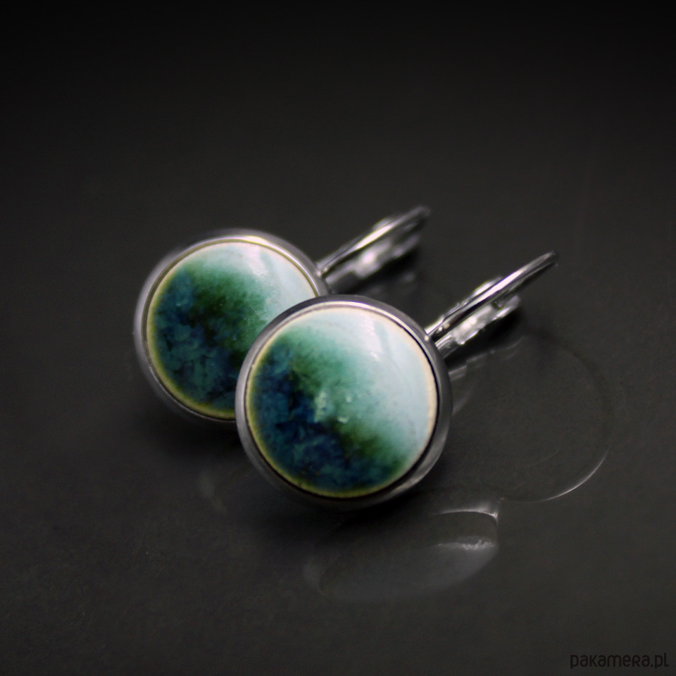 Okrągłe  ceramiczne kolczyki,  ręcznie wykonane z  delikatnej  jasnobeżowej gliny  kamionkowej,  szkliwione mieszanką  turkusowo zielonych  szkliw  z efektem  plamek, na  zamkniętych biglach  w kolorze srebrnym.  Średnica  elementu  ceramicznego ok.  12mm, długość bigla  ok 19mm. Polecam