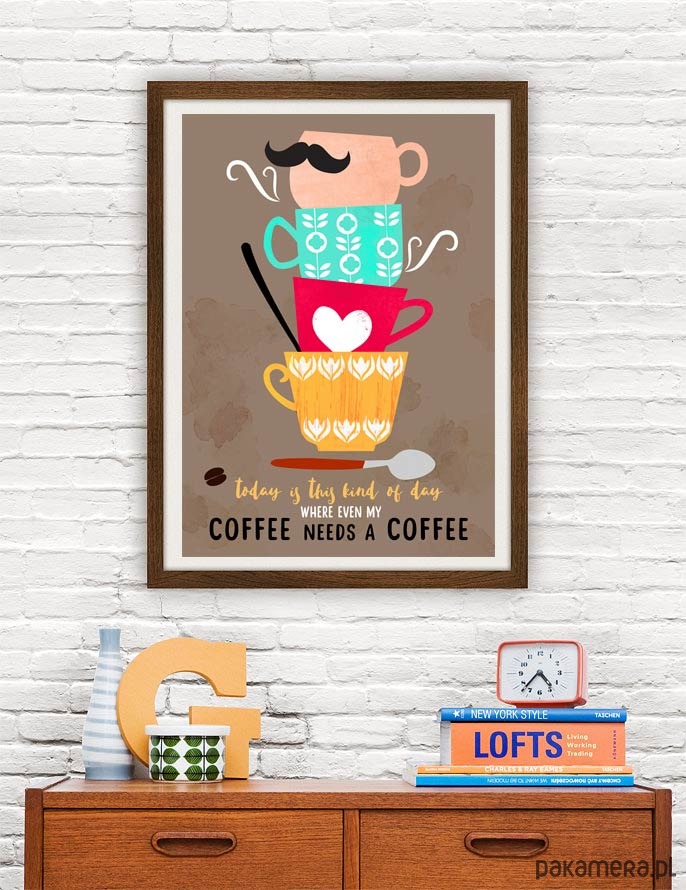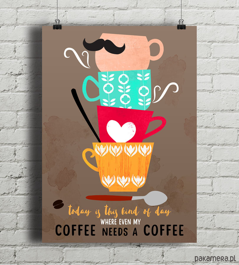 Plakat w stylu skandynawskim z autorską grafiką przedstawiającą filiżankę i kubki do kawy podpisane "Today is this kind of day where even my coffee needs a coffee". Oryginalna dekoracja do wymarzonej kuchni, salonu i pokoju. Zaprojektowany przez niemiecką artystkę Elisandrę Sevenstar.