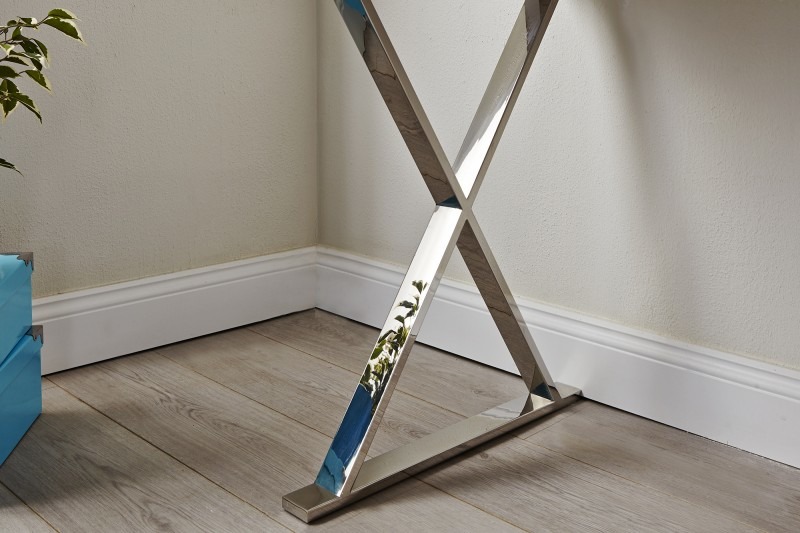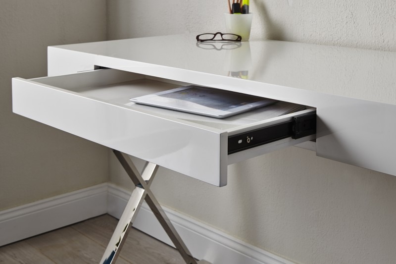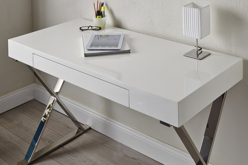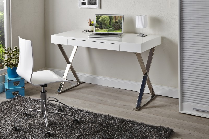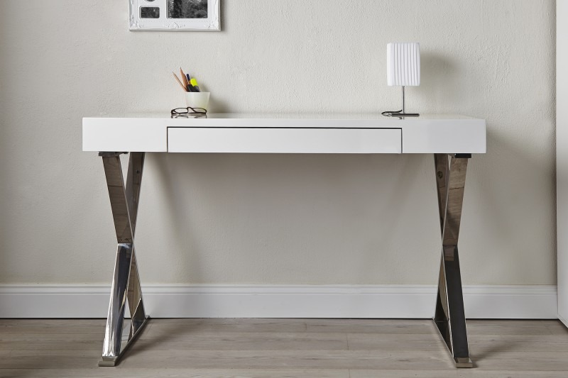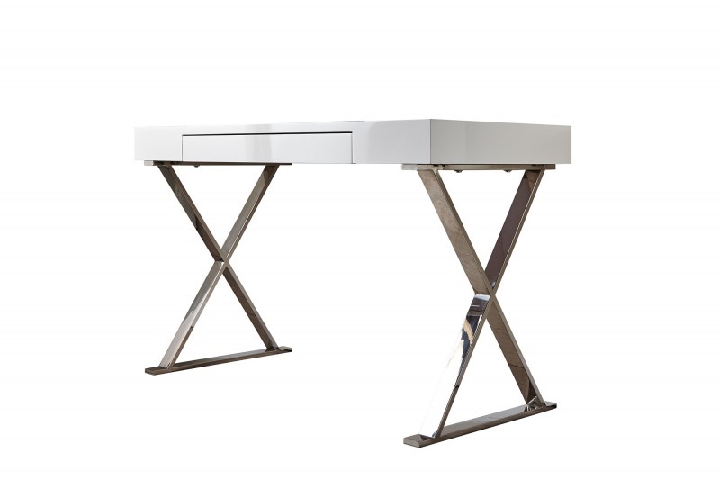 Szukasz zgrabnego biurka niewielkich rozmiarów, w modnej bieli? To coś dla Ciebie. Niezwykle urocze biurko, z praktyczną szufladą na srebrnych nogach ułożonych krzyżowo. Biurko wykonane jest z lakieru odpornego na ścieranie. Dlatego nadaje się także do gabinetów, hoteli czy do punktu obsługi klienta.
