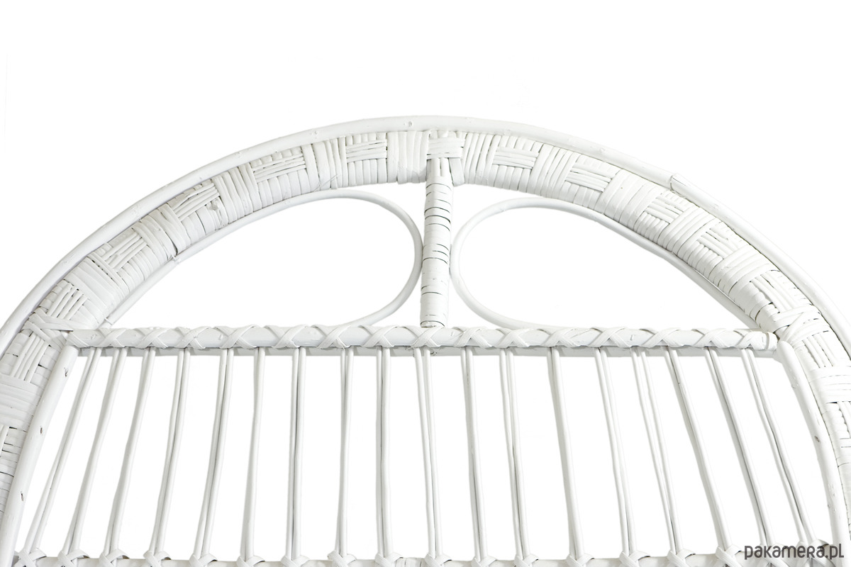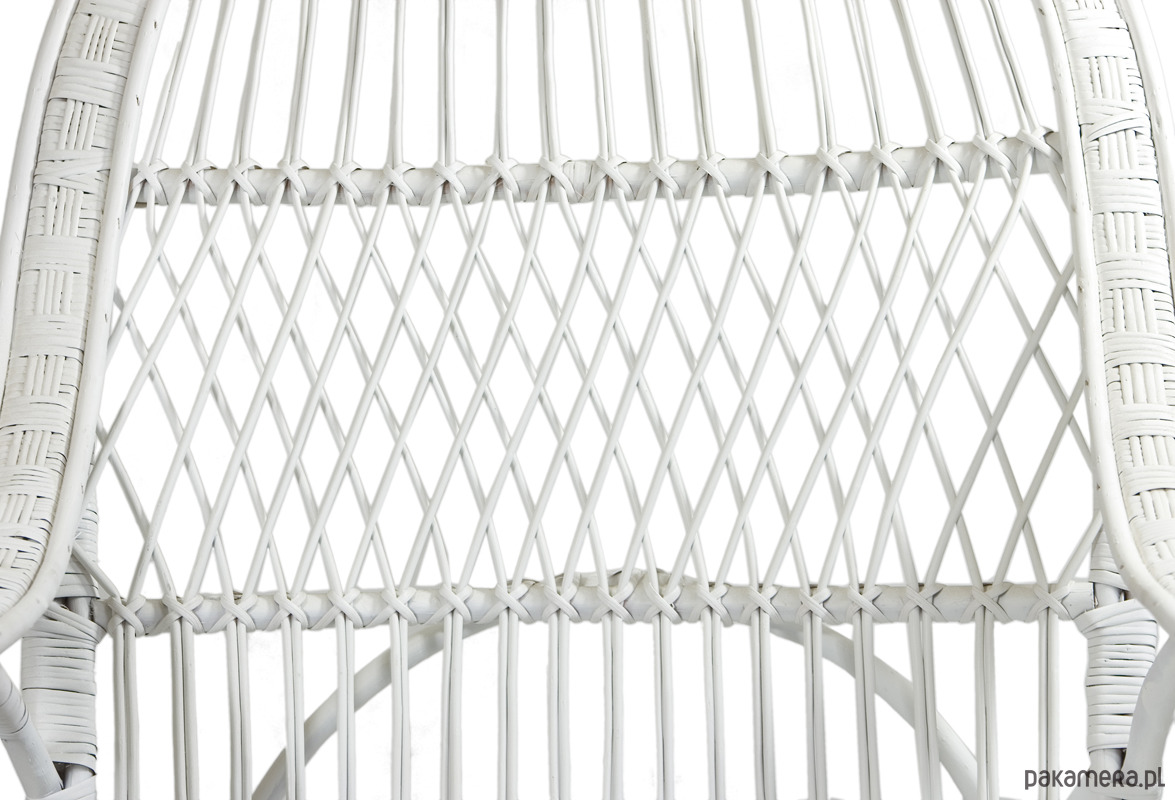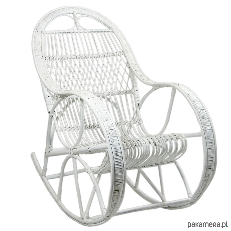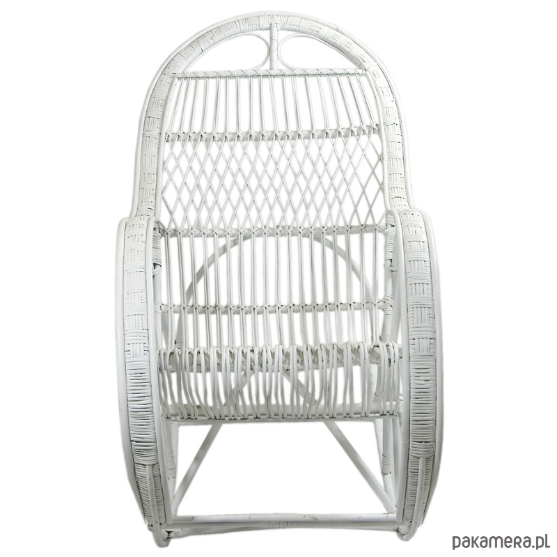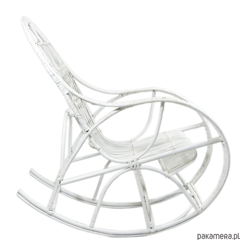 Oryginalny fotel bujany, wykonany z wikliny, barwionej na odcień bieli.