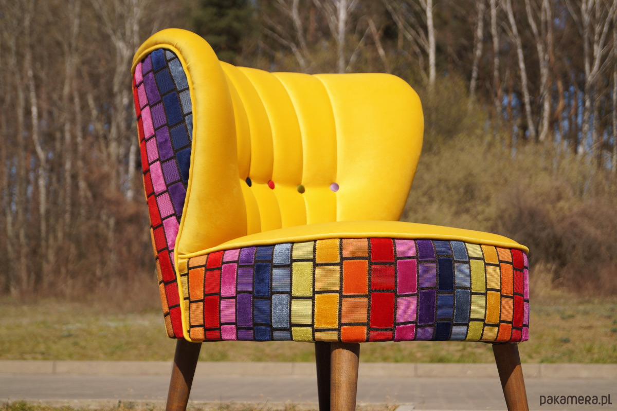 Polecam na sprzedaż fotel kluboey. Fotel całkowicie nowy, na sprężynach. Obity wysokiej jakości materiałem, aksamitnym w dotyku. Tył i bok fotela obite wielobarwnym welurem. Nóżki mogą być wybarwione na dowolny kolor.