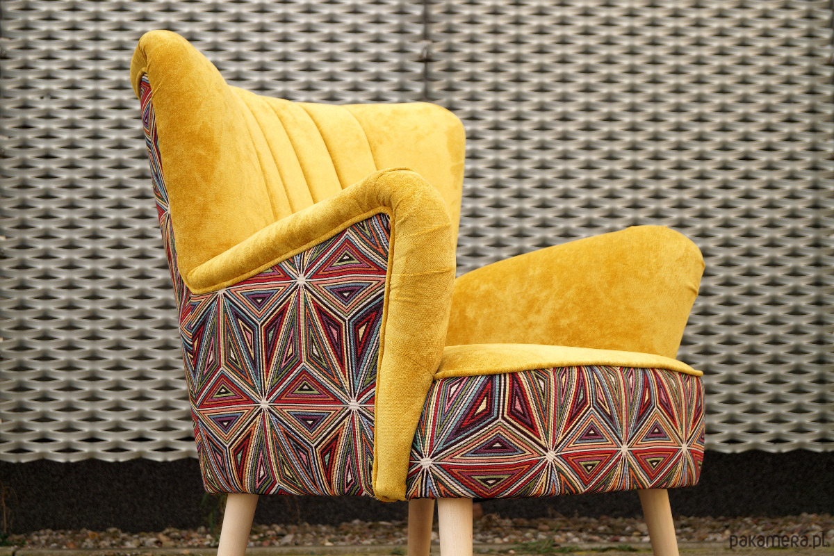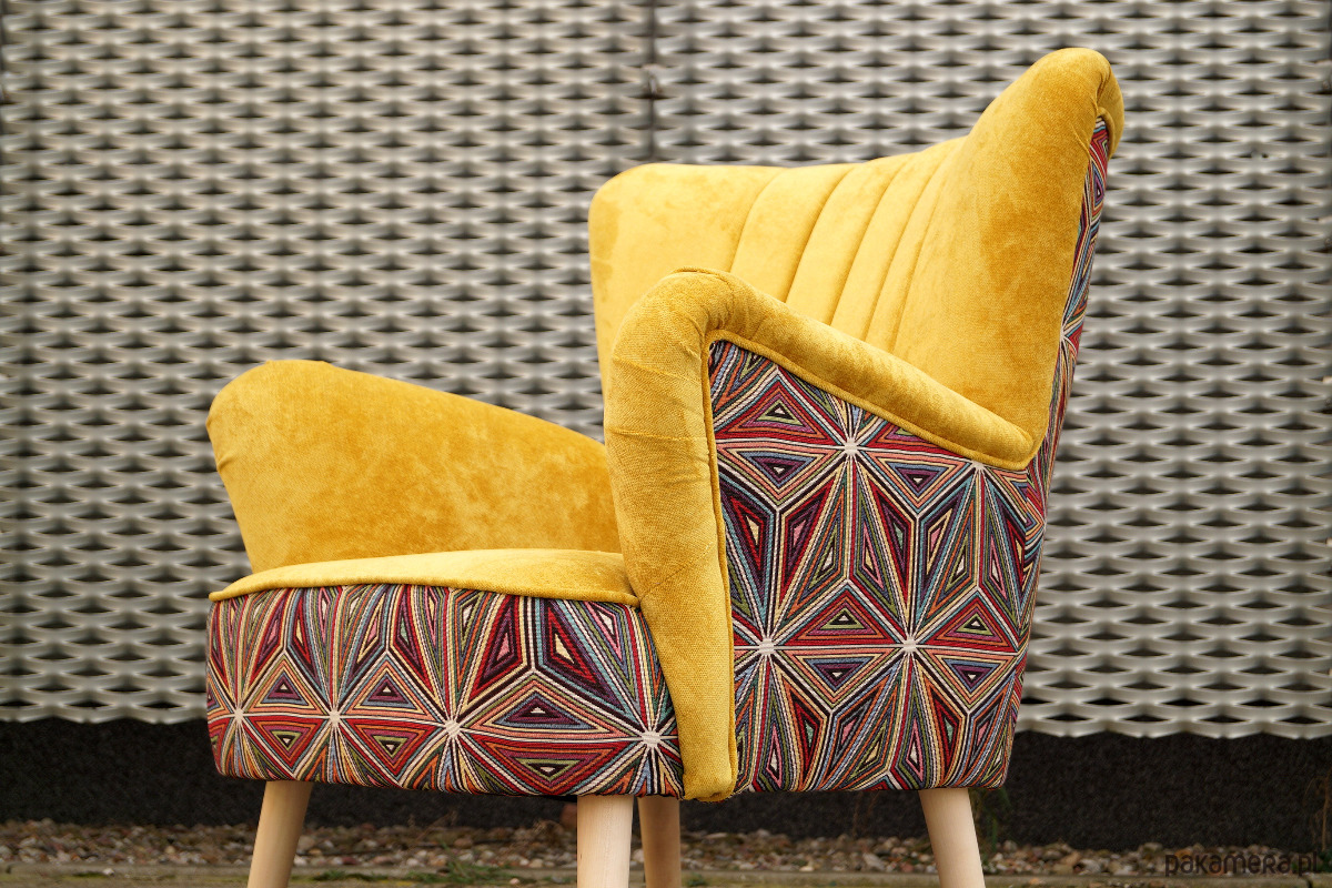 Pracownia Fotelownia poleca na sprzedaż fotel klubowy z podłokietnikami tapicerowanymi. Fotel całkowicie nowy, na sprężynach. Na tyle i boku użyty jest materiał typu żakard we wzór geometryczny. Drewno (nogi) może być wybarwione na dowolny kolor. Fotel idealnie nadaje się do niewielkich wnętrz: salon, sypialnia, pokój dziecięcy lub do kawiarni, butiku.