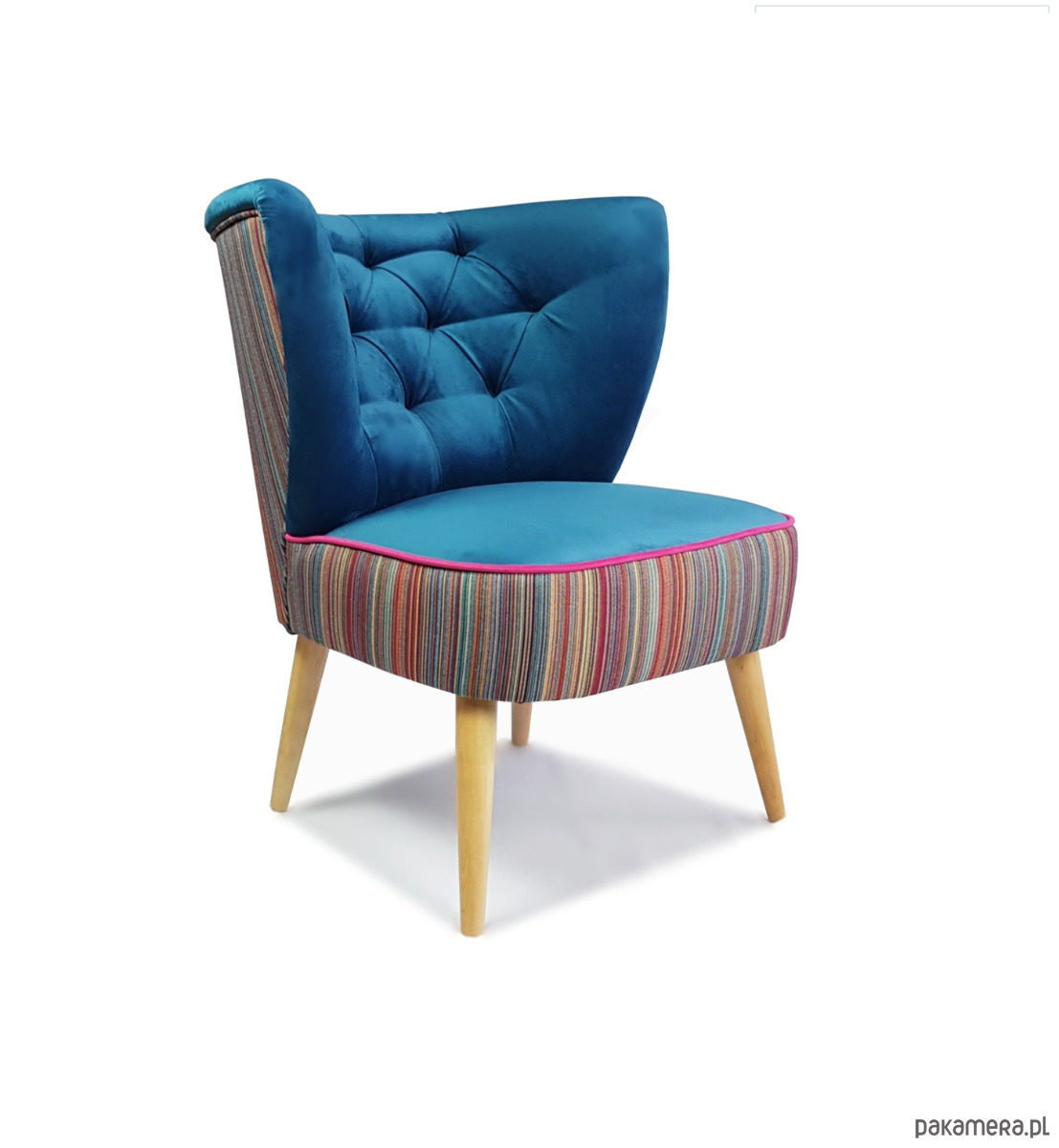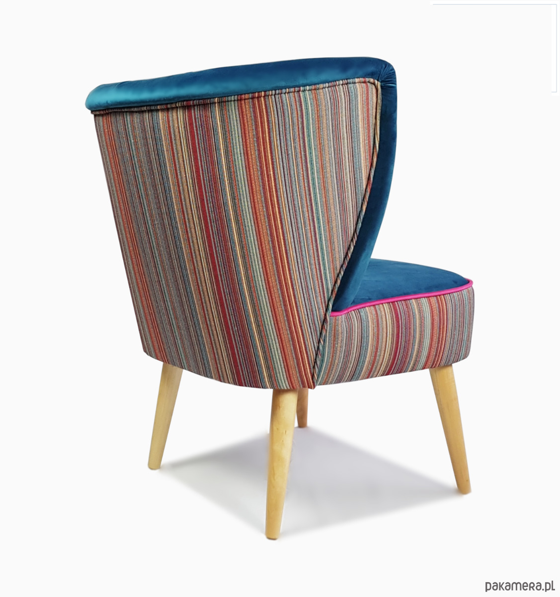 Fotel zachowany w stylistyce lat '60, bardzo wygodny dzięki sprężynom na siedzisku.