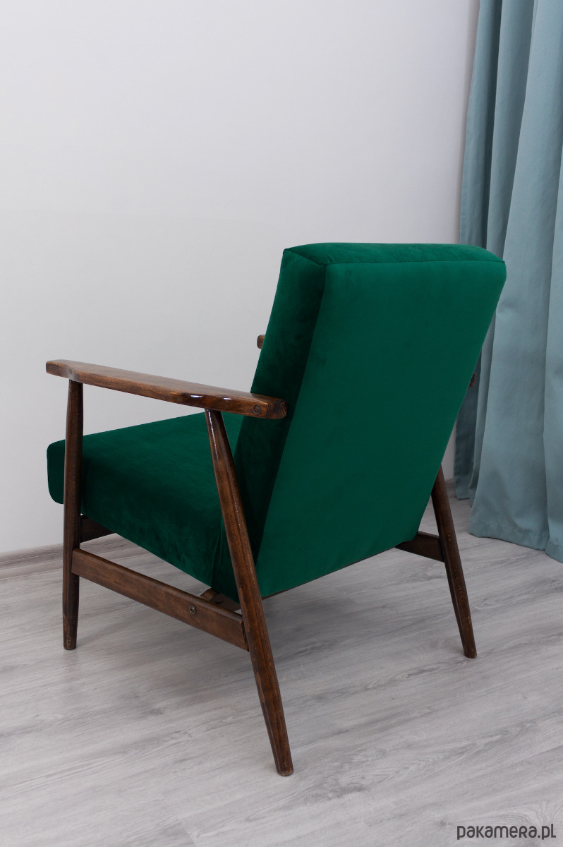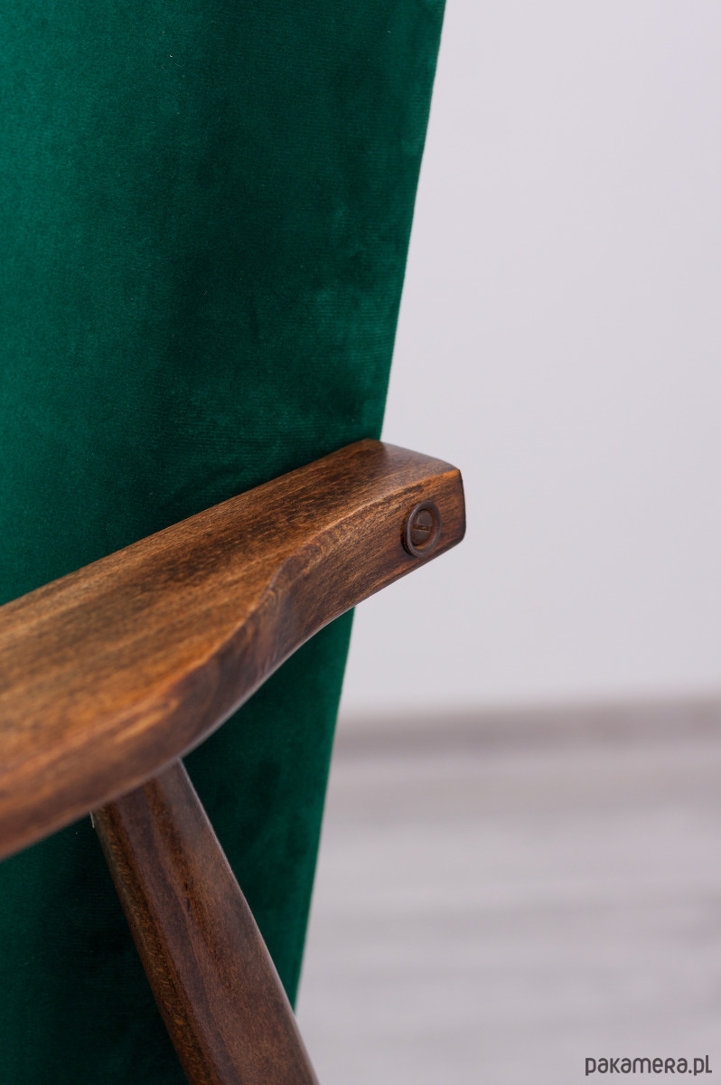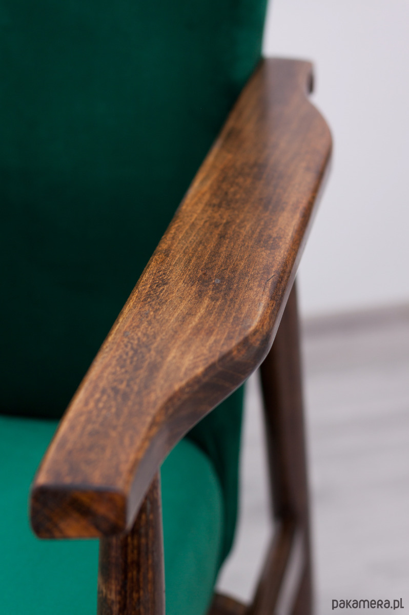 • prawie półwieczna rama fotela (z lat 70!) z drewna bukowego w oryginalnym, bardzo dobrym stanie – została odnowiona i zabezpieczona substancją nadającą jej swój unikalny kolor.