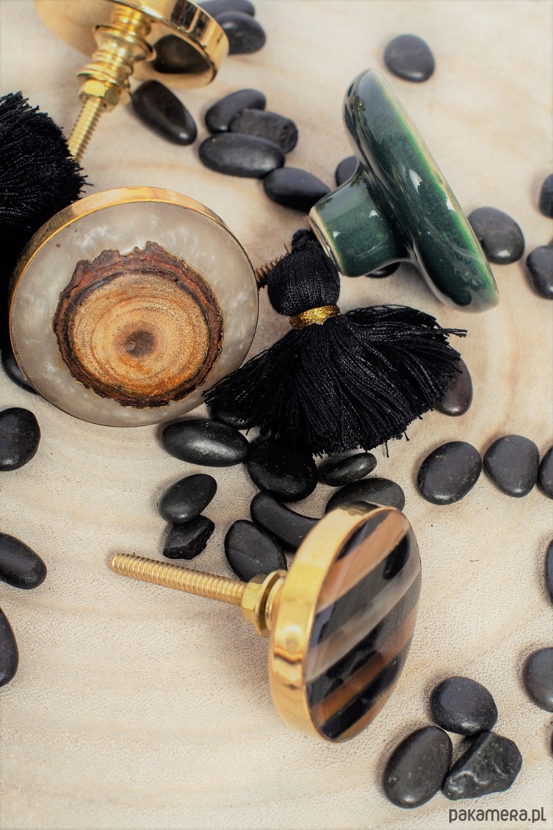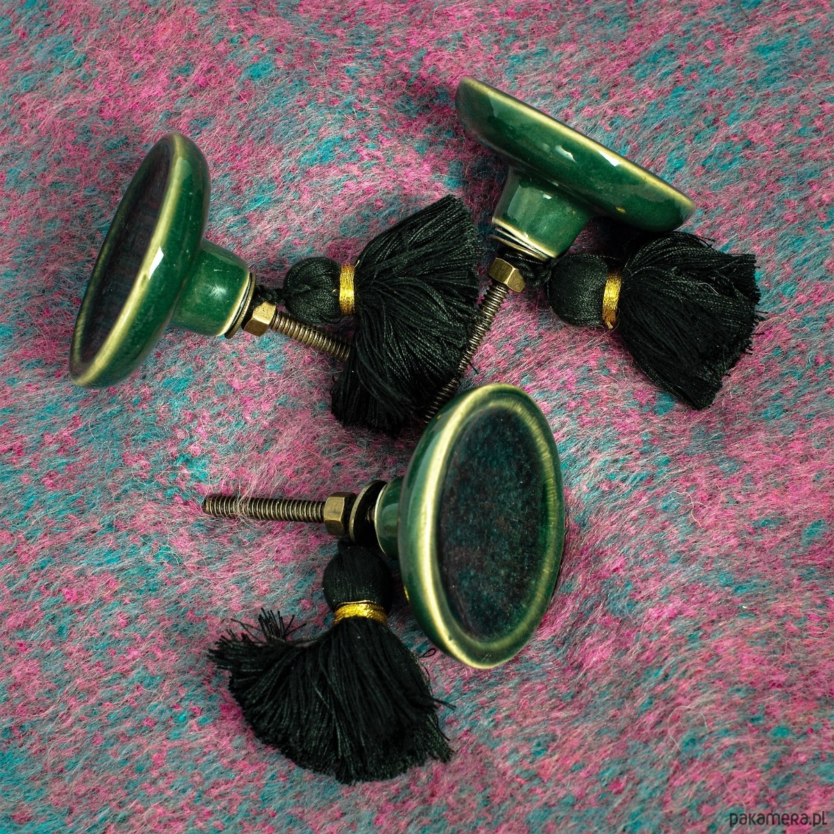 Piękna gałka meblowa wykonana z porcelany w kolorze butelkowej zieleni. Dodatkowo zdobiona przepięknym frędzlem w kolorze czarnym ze złotą nitką. Zestaw zawiera śrubę do montażu. Piękna, ręcznie wykonana. Idealna do mieszkań urządzonych w stylach od boho, retro aż po stylowe i nowoczesne. Unikatowe i piękne i jedyne w swoim rodzaju wzory. Bardzo szybkie i łatwe mocowanie.