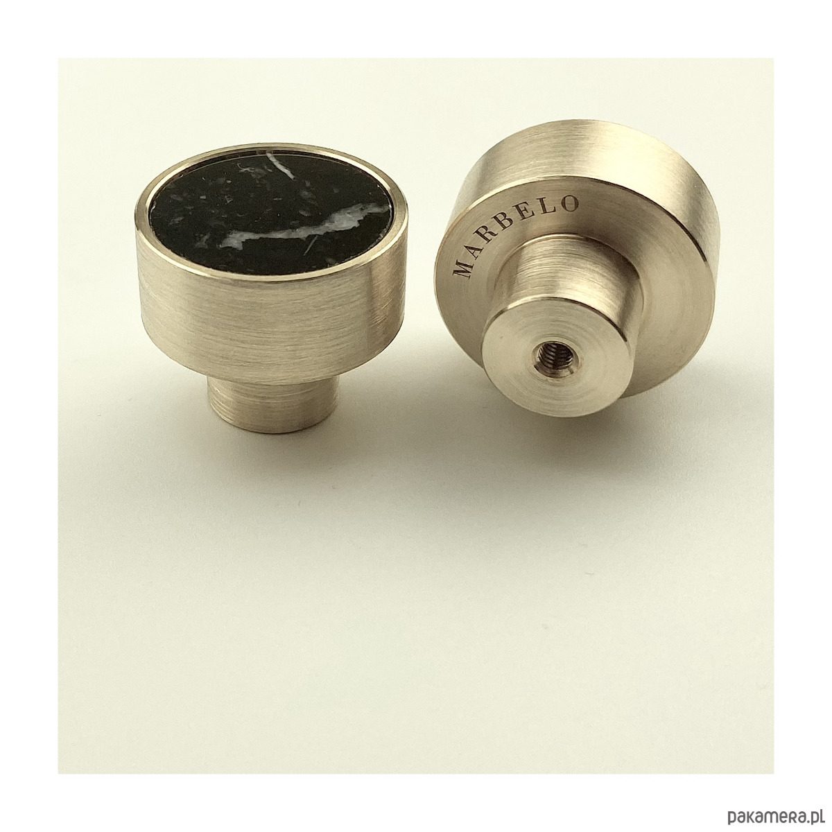 Klasyczny, mosiężny uchwyt meblowy wypełniony czarnym marmurem Nero Marquina, wysokiej jakości materiałem sprowadzonym z Hiszpanii.