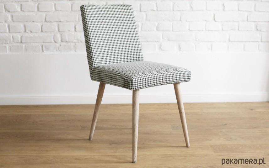 Odnowione ręcznie polskie krzesła z przełomu lat 60. i 70. XX wieku. Piękna klasyczna forma, tkanina w monochromatyczną pepitę. Możliwy także wybór innych kolorów i tkanin. Nogi z surowego drewna pokrytego lakierem o satynowym wykończeniu.