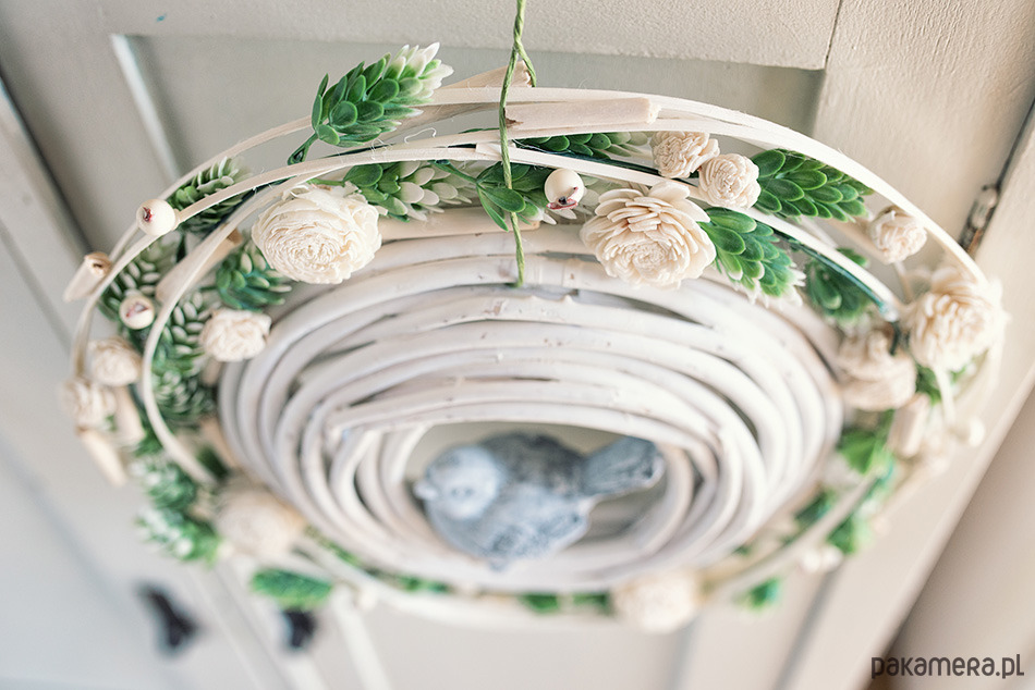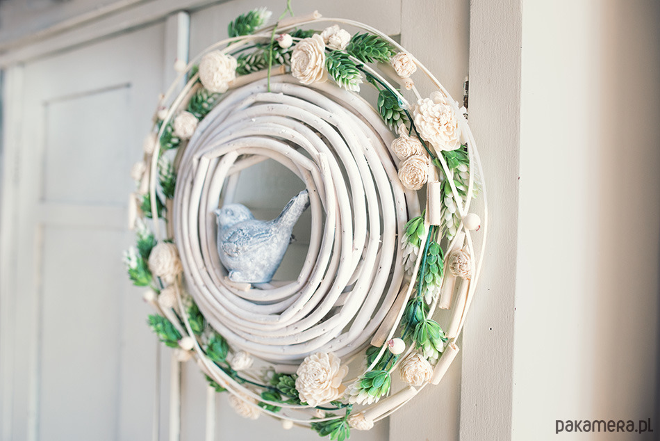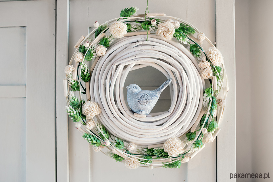 Biały wianek opleciony został zielonymi roślinkami ( sztuczny chmiel ), wybielanym ratanem. Elementy dekoracyjne to kremowe kuleczki, patyczki oraz ceramiczny, szary ptaszek.