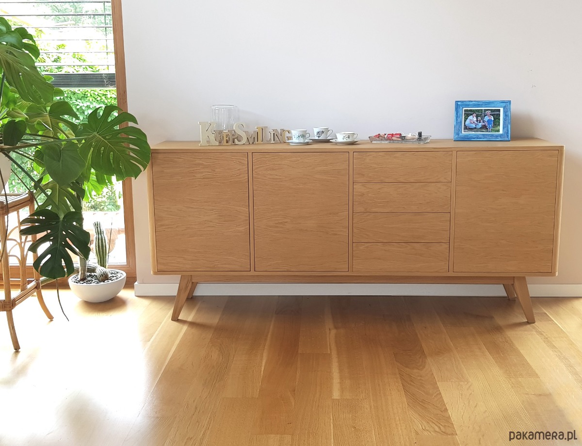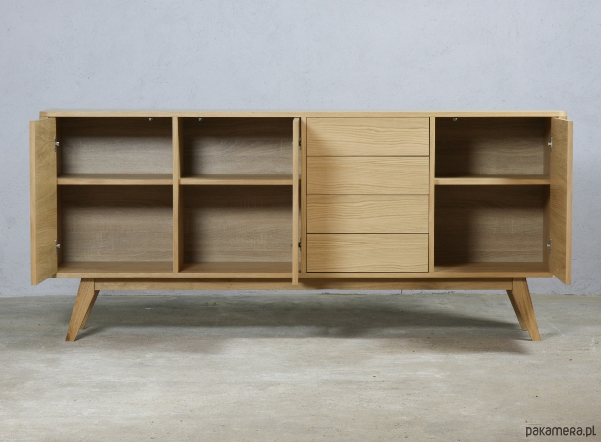 Komoda Bufetowa XL to propozycja dla tych którzy chcieliby ukryć jeszcze więcej . Przemyślany układ półek zapewnia miejsce dla butelek z winem, kieliszków, sprzętu audio, płyt winylowych, segregatorów z dokumentami, małej drukarki i wielu innych domowych przedmiotów które chcielibyśmy w niej schować. Prostą formą nawiązuje do klasycznych skandynawskich rozwiązań.