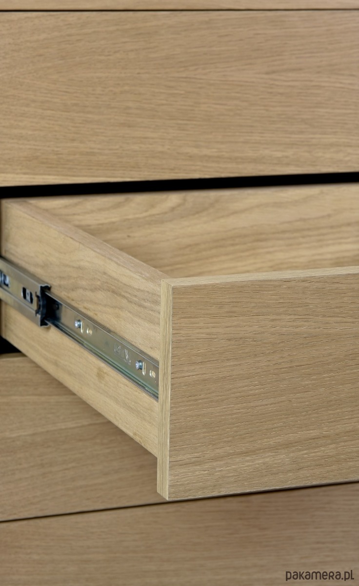 Fronty otwierają się przez delikatne naciśnięcie, a prowadnice szuflad umożliwiają ich pełne wysunięcie tym samym ułatwiając dostęp do całej przechowywanej zawartości.