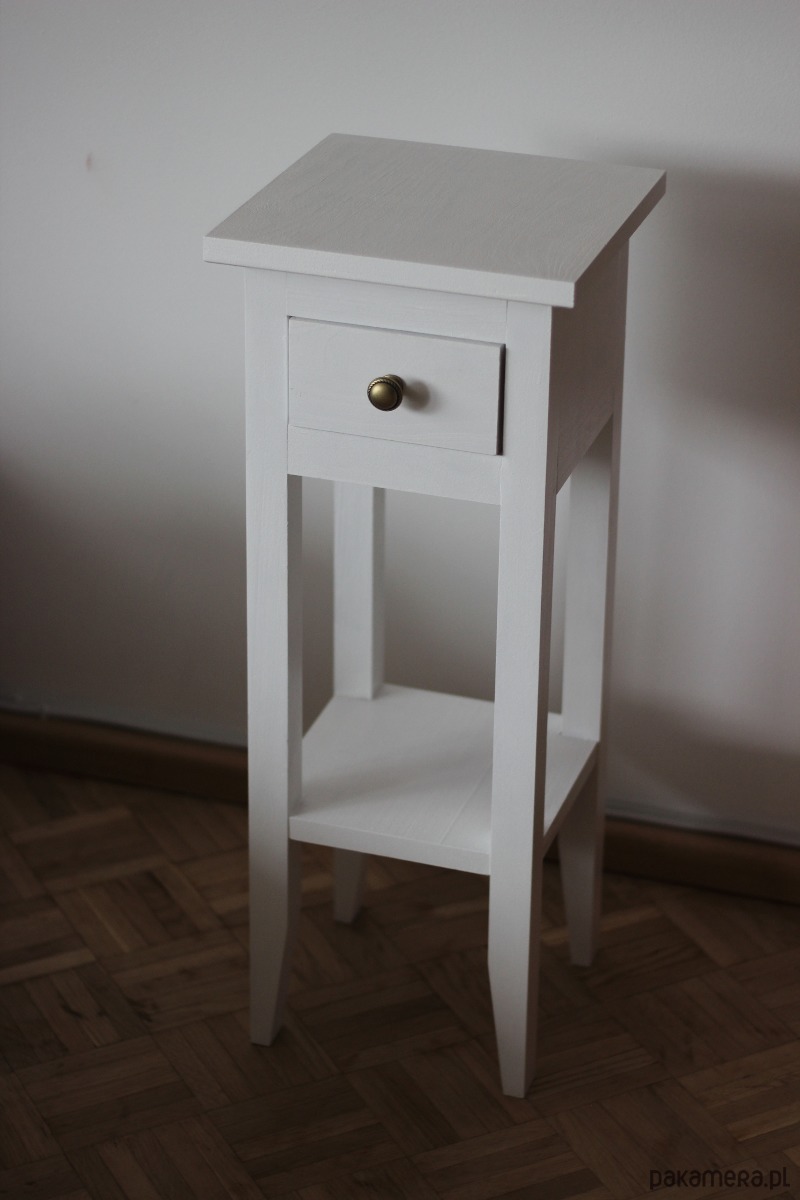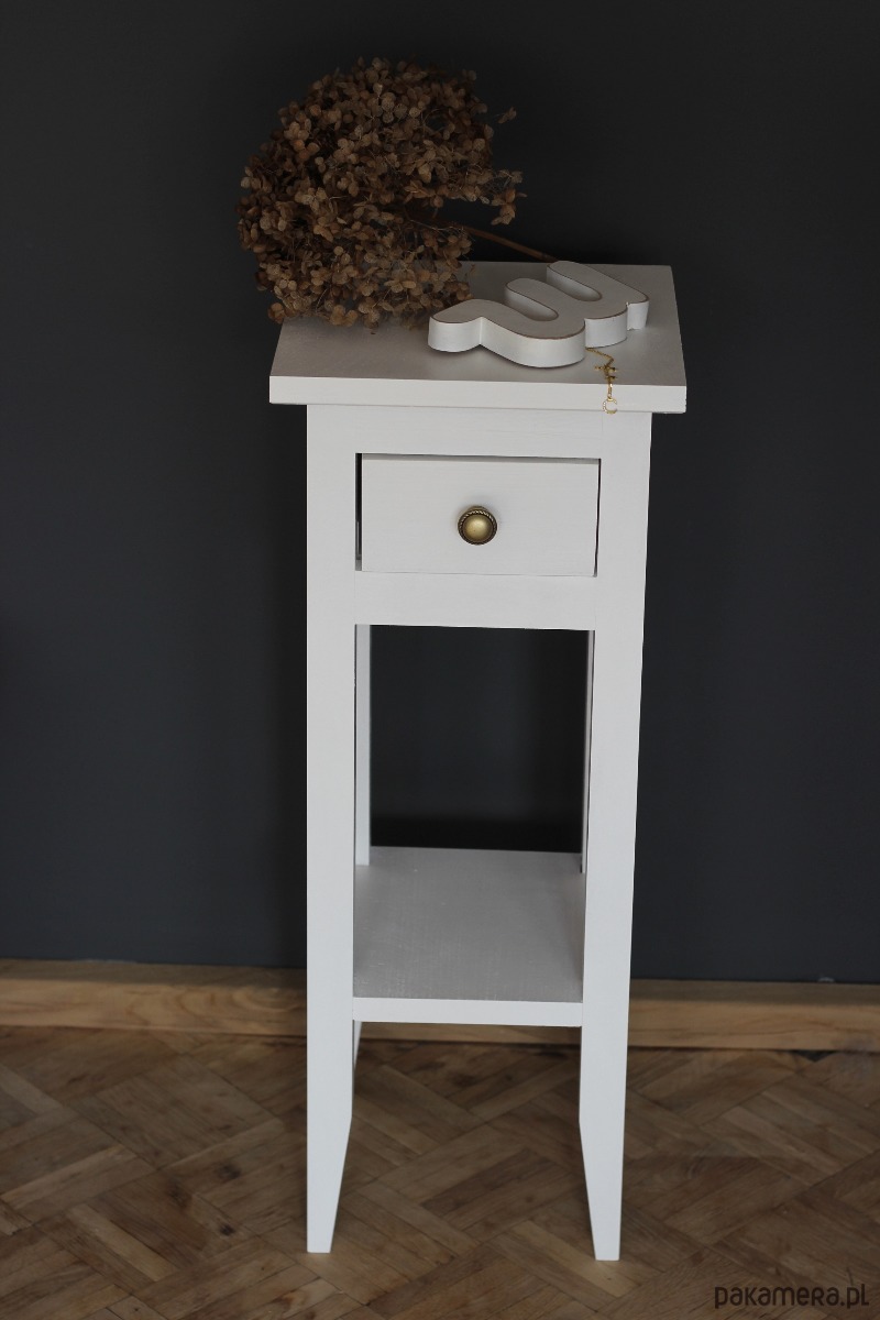 Wysoki stolik nocny minimal, wykonany z drewna sosnowego w kolorze białym .