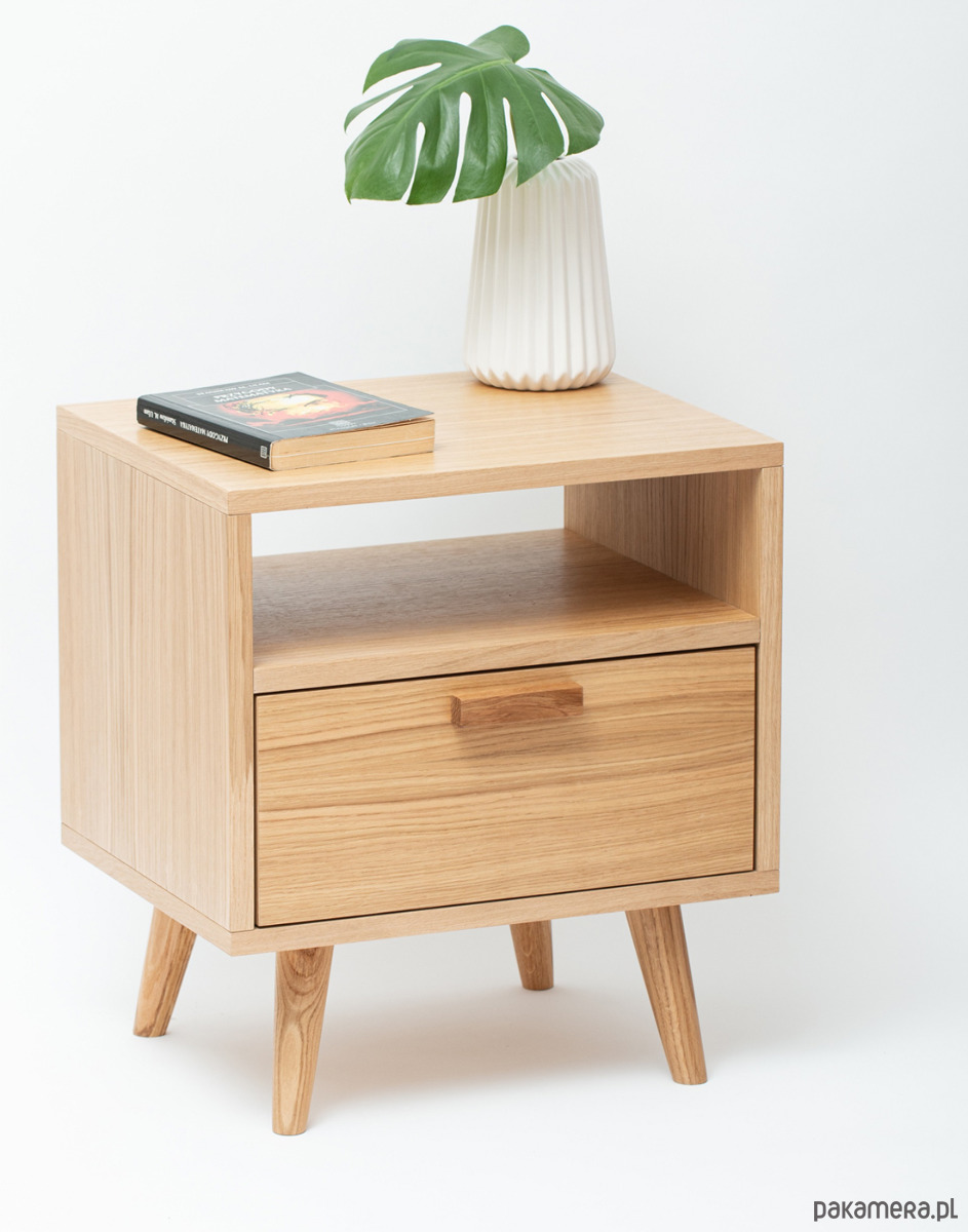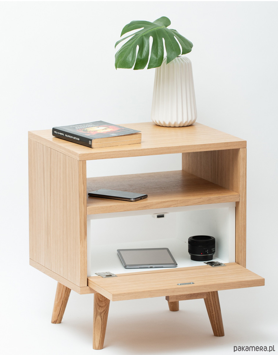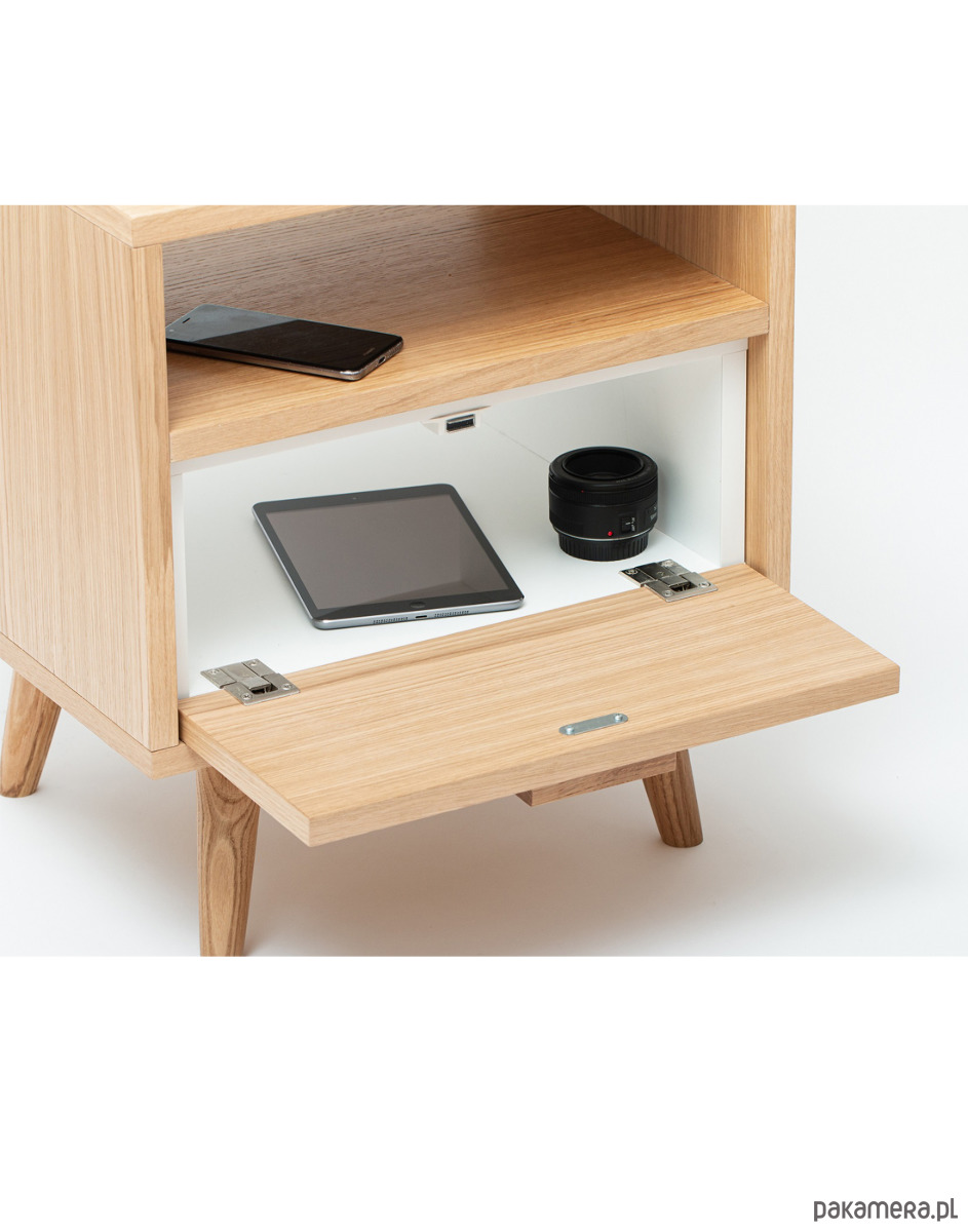 Szafka wyposażona została w pojemną półkę wykonaną z klasycznej płyty meblowej w kolorze białym (gr.18mm) z frontem barkowym fornirowanym, w której z łatwością zmieszczą się podręczne przedmioty jak np. ładowarki, książki, tablet itp.